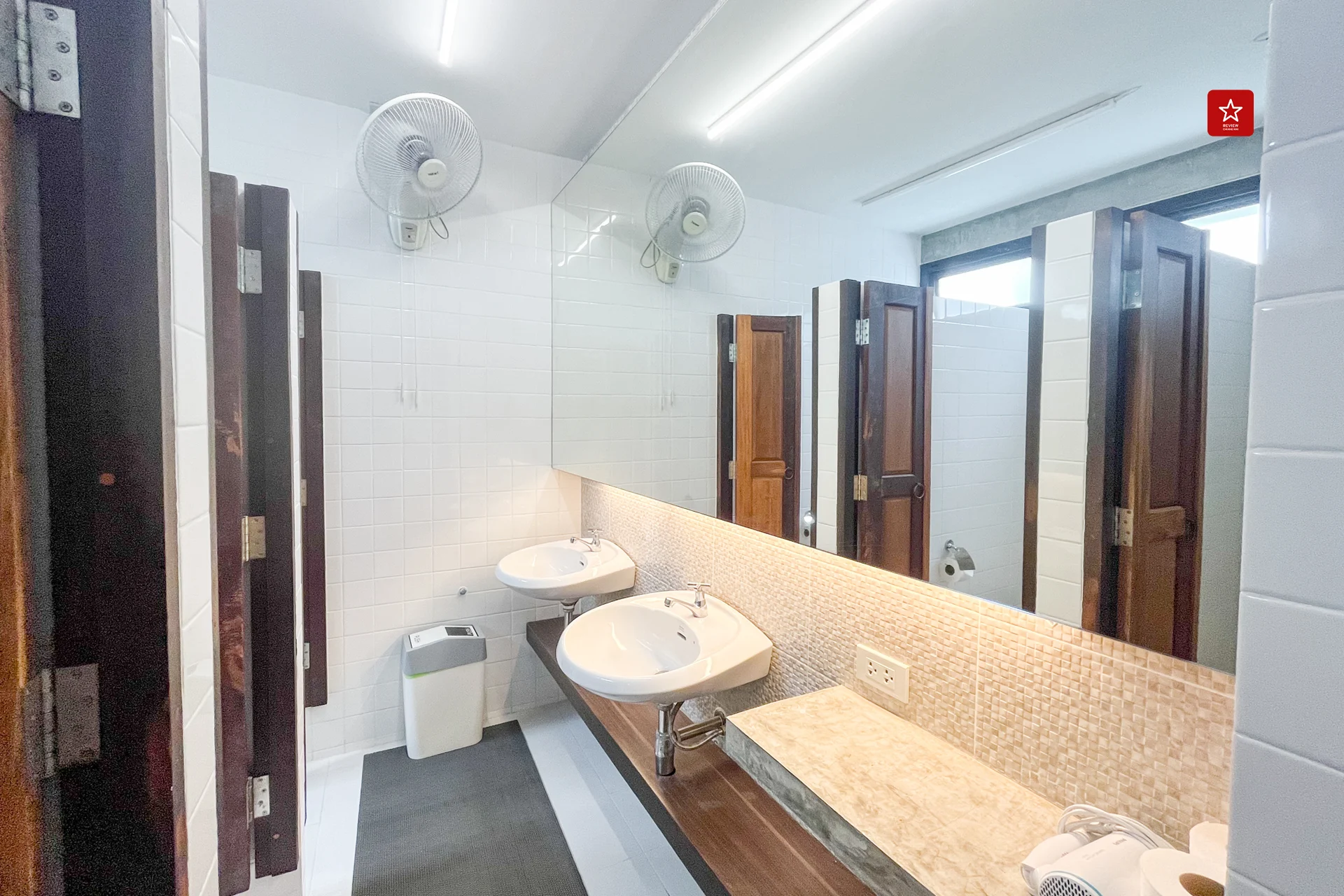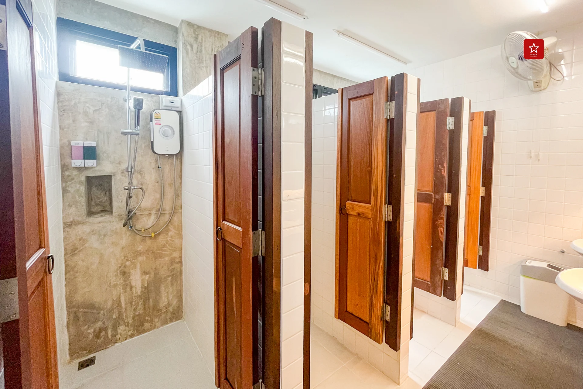 ส่วนนี่จะเป็นห้องน้ำรวมในห้องพักชั้นล่าง แยกชายหญิง ห้องน้ำสวยเลยทีเดียว แยกห้องอาบน้ำและห้องทำธุระด้วยนะ