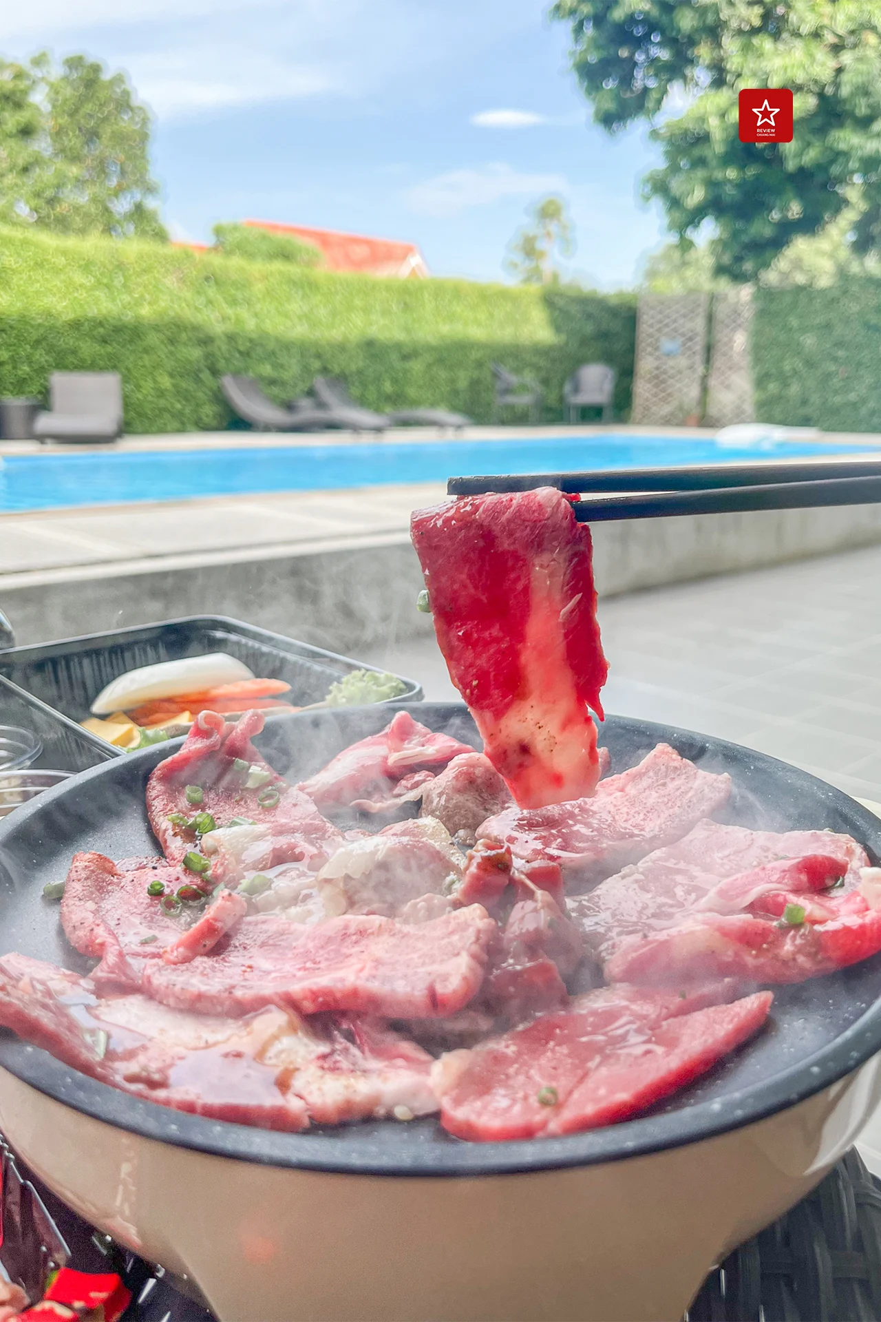 ตกเย็นแอดก็ขอจัดปาร์ตี้เนื้อย่างกันซักหน่อย อันนี้สั่งมาจากข้างนอกนะ และจะต้องเหมาที่พักทั้งตึกด้วย ถึงจะย่างเนื้อกระทะแบบนี้ ไม่งั้นจะไปรบกวนแขกท่านอื่นๆ นั่งกินกันบริเวณนี้ฟีลกำลังดีเลยฮะ