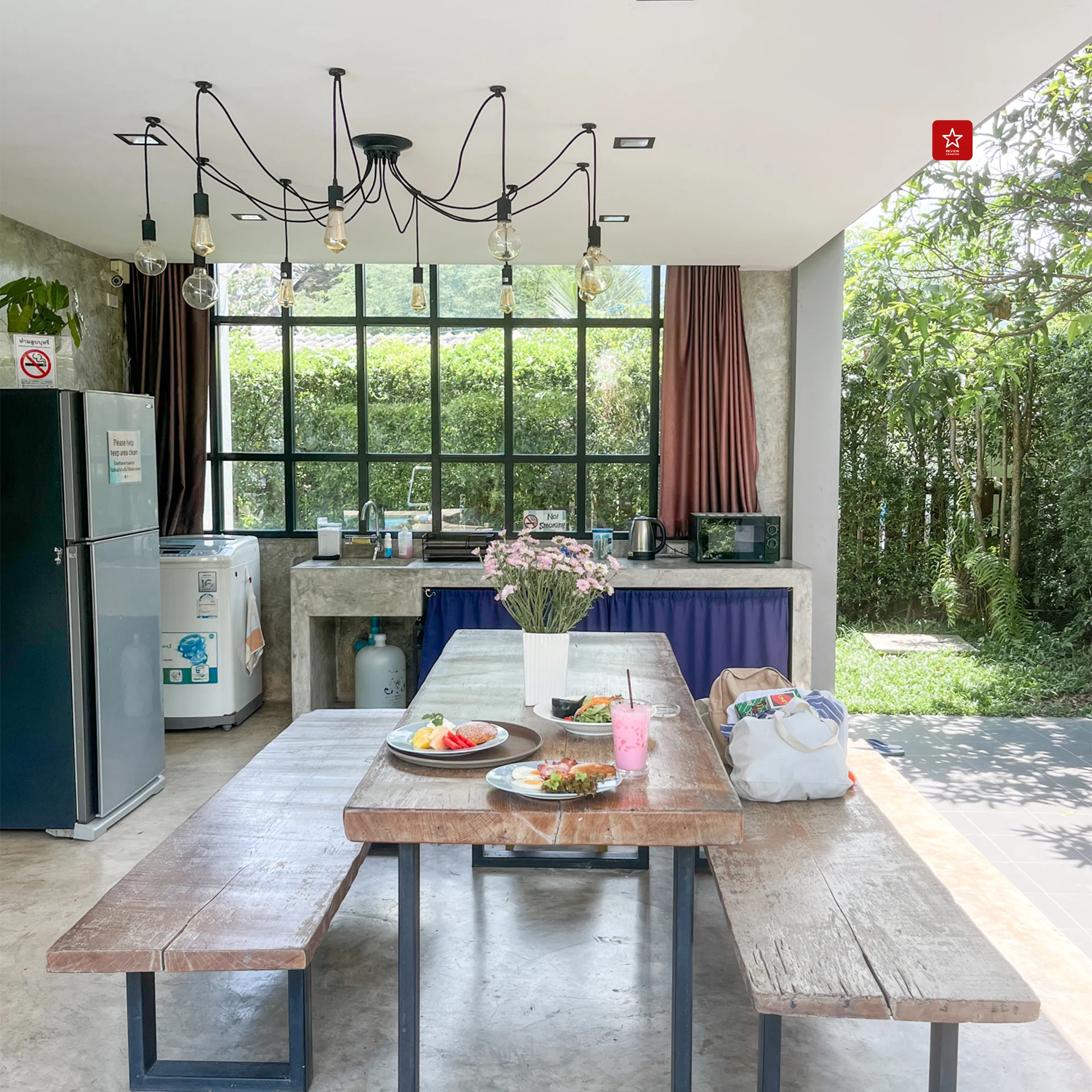 ตรงที่พัก จะมีโซนโต๊ะทานข้าวตัวใหญ่ๆ ตรงนี้ มันให้พื้นที่ในการทำกิจกรรมที่กว้างมาก แถมติดข้างสระด้วย แอดชอบนั่งตรงนี้มาก