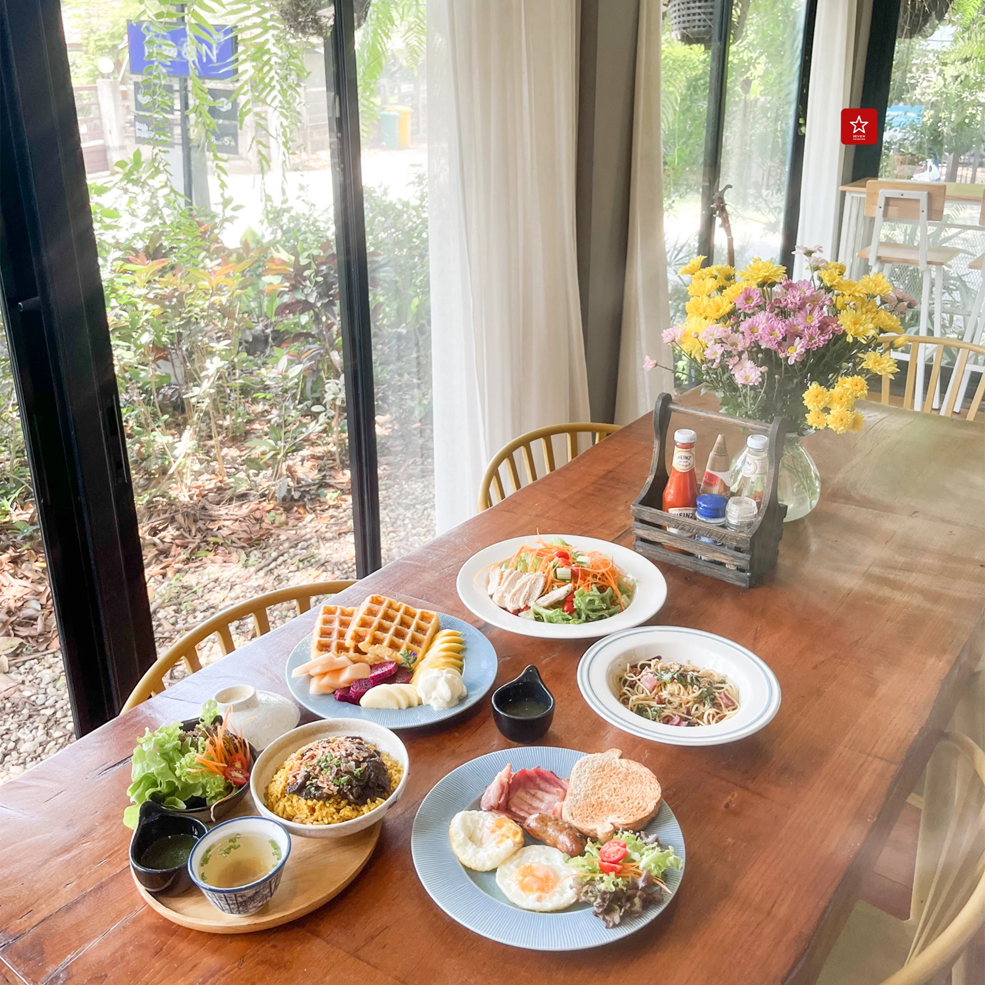 อาหารที่นี่ก็ใช่ย่อยนะ มีให้เลือกหลายอย่าง แต่ละเมนูเหมือนผ่านการคิดมาแล้วว่า มันคือเมนูที่เหมาะสำหรับการรับประทานกับที่พักที่นี่ จะถ่ายรูปอาหารกับบรรยากาศก็สวย ยกตัวอย่างเช่น ชุดอาหารเช้าไข่ดาว เราจะมานั่งกินที่โต๊ะริมกระจกที่คาเฟ่ มีผ้าม่านสีขาวประดับอยู่ ถ่ายรูปออกมาจะได้ฟีลกู๊ดในยามเช้ามาก หรือว่าจะเป็น วาฟเฟิลเสิร์ฟกับผลไม้ตามฤดูกาล อันนี้แอดเอาไปนั่งกินข้างสระน้ำ ได้ฟีลฝรั่งในวันพักผ่อนสบายๆ แบบสุดๆ