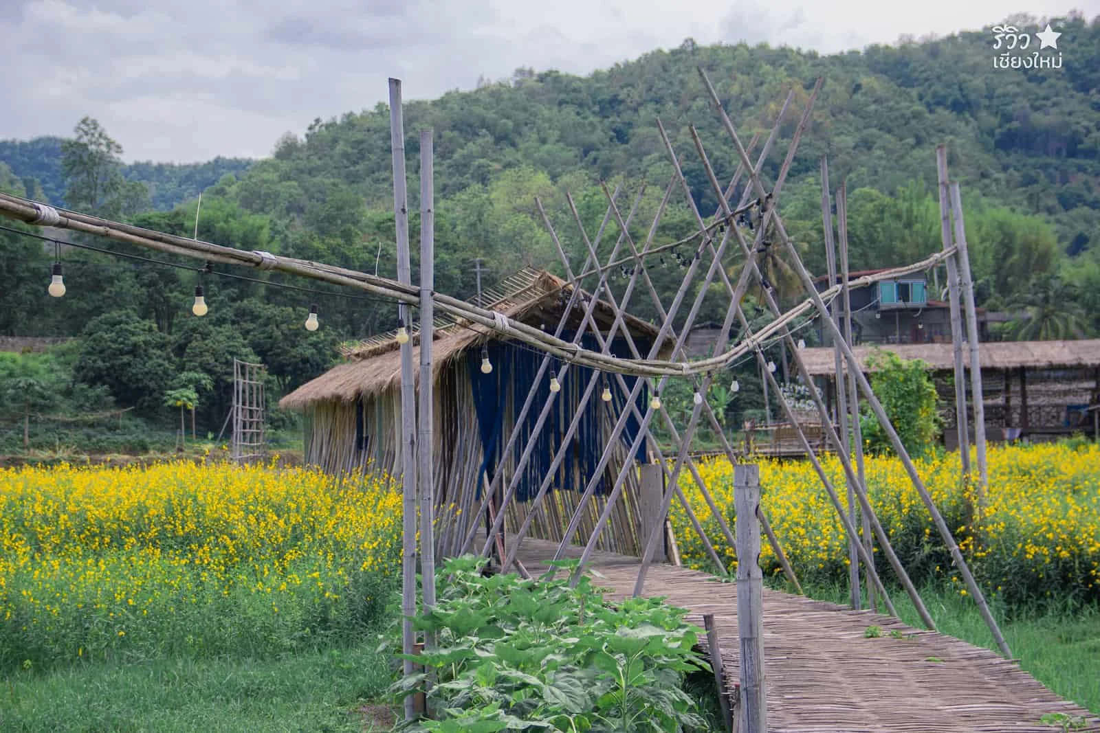 จุดเด่นแบบเด่นสุดๆของร้านคงหนีไม่พ้นสะพานไม้ไผ่หรือสะพานฮอมฮัก ที่มีความเป็นมาจากชาวบ้านและคนในพื้นที่ต่างช่วยกันทำเพื่อเป็นทางเชื่อมระหว่างสองหมู่บ้านใช้สัญจรไปมาหาสู่กันได้รวดเร็วขึ้น จนกลายเป็นแลนด์มาร์คของร้าน ที่ตอนนี้ยังโอบล้อมไปด้วยทุ่งปอเทืองสีเหลือง ถ่ายรูปมุมไหนก่องาม มุมไหนก่อเปิงเจ้า