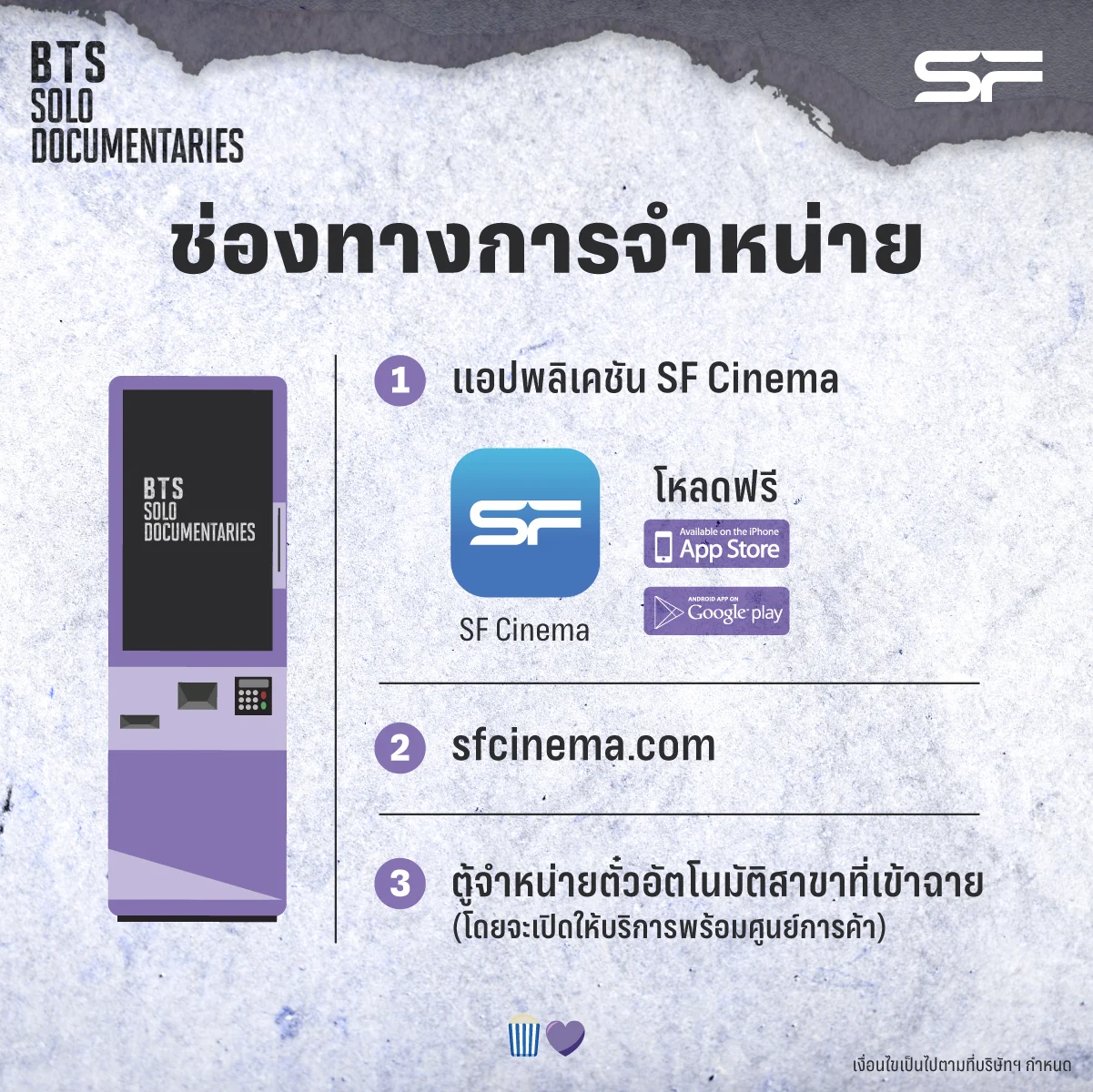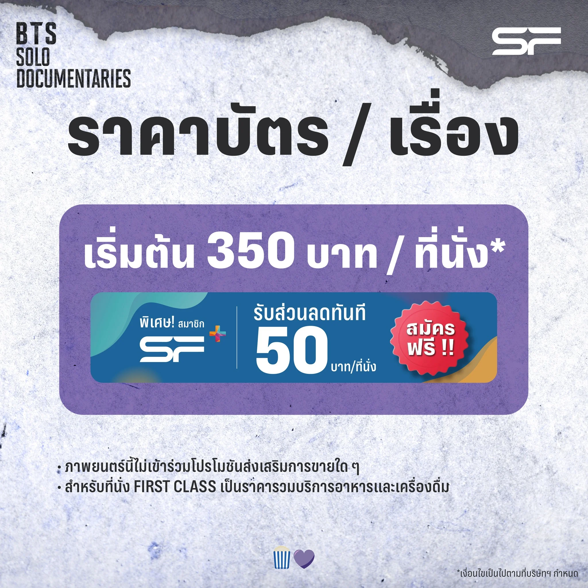 บัตรราคาเริ่มต้น 350 บาท (ที่นั่ง / เรื่อง) สาขากรุงเทพฯ เริ่มต้น 400 บาท (ที่นั่ง / เรื่อง) สมาชิก SF+ รับส่วนลดทันที 50 บาท / ที่นั่ง