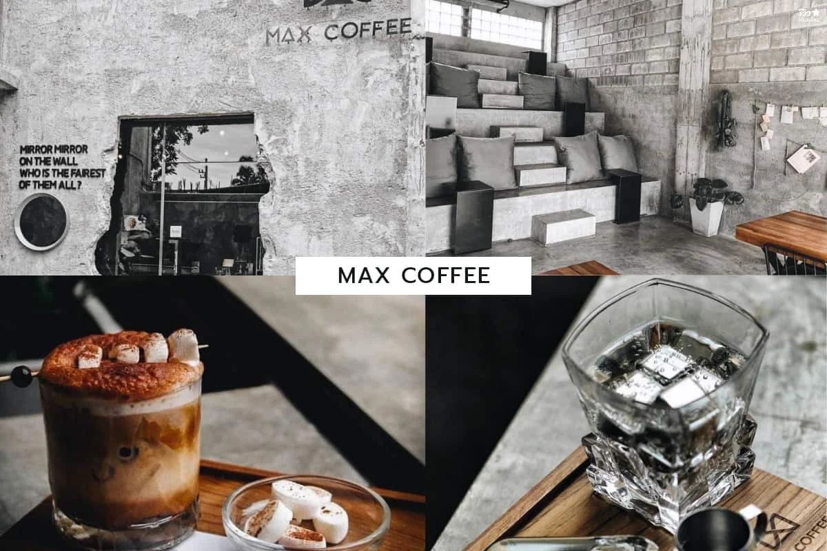 คาเฟ่สไตล์ Brutalist Architecture ที่นำความดิบของปูนเปลือย มาเติมสีสันเอาใจสายดาร์ค มีเมนู Signature หลากหลาย เช่น Butterfly Pea Cappucino, Black Pink, Honey Rock coffee และ Drip Coffee ต่างๆ ที่มีเมล็ดกาแฟหลากหลายสายพันธุ์ นอกจากนี้ยังมีเมนูอาหารต่างๆเช่น Max Sandwich, Max Roti Beef ด้วยน้า
