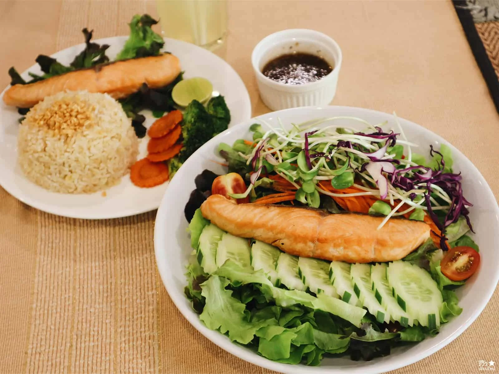 นอกจากนี้ทางร้านยังมีเมนู Salad และอาหารจานเดียวอีกหลายเมนูให้เลือกด้วยน้าในรูปจะเป็น Salad with grilled Salmon ราคา 120.- และ ข้าวผัดกระเทียมแชลมอนย่าง 120.-