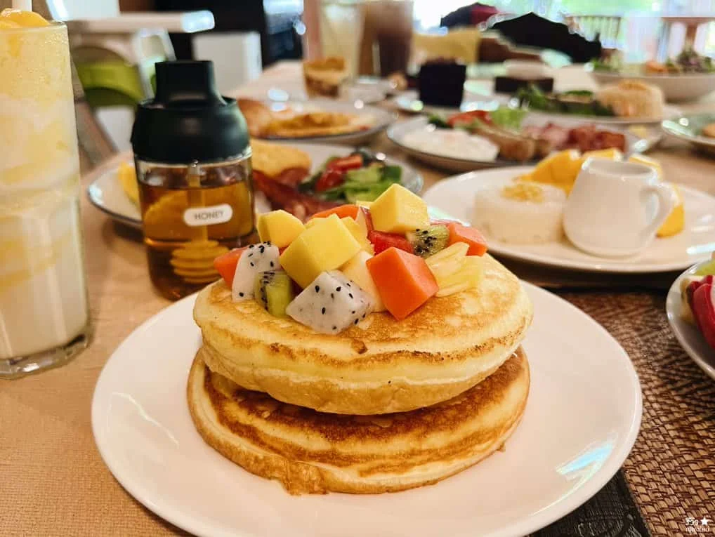 เมนู Pancakes with Fresh Fruit ราคา 125.- ราดด้วยน้ำผึ้ง นุ่มๆ หอม ละมุน