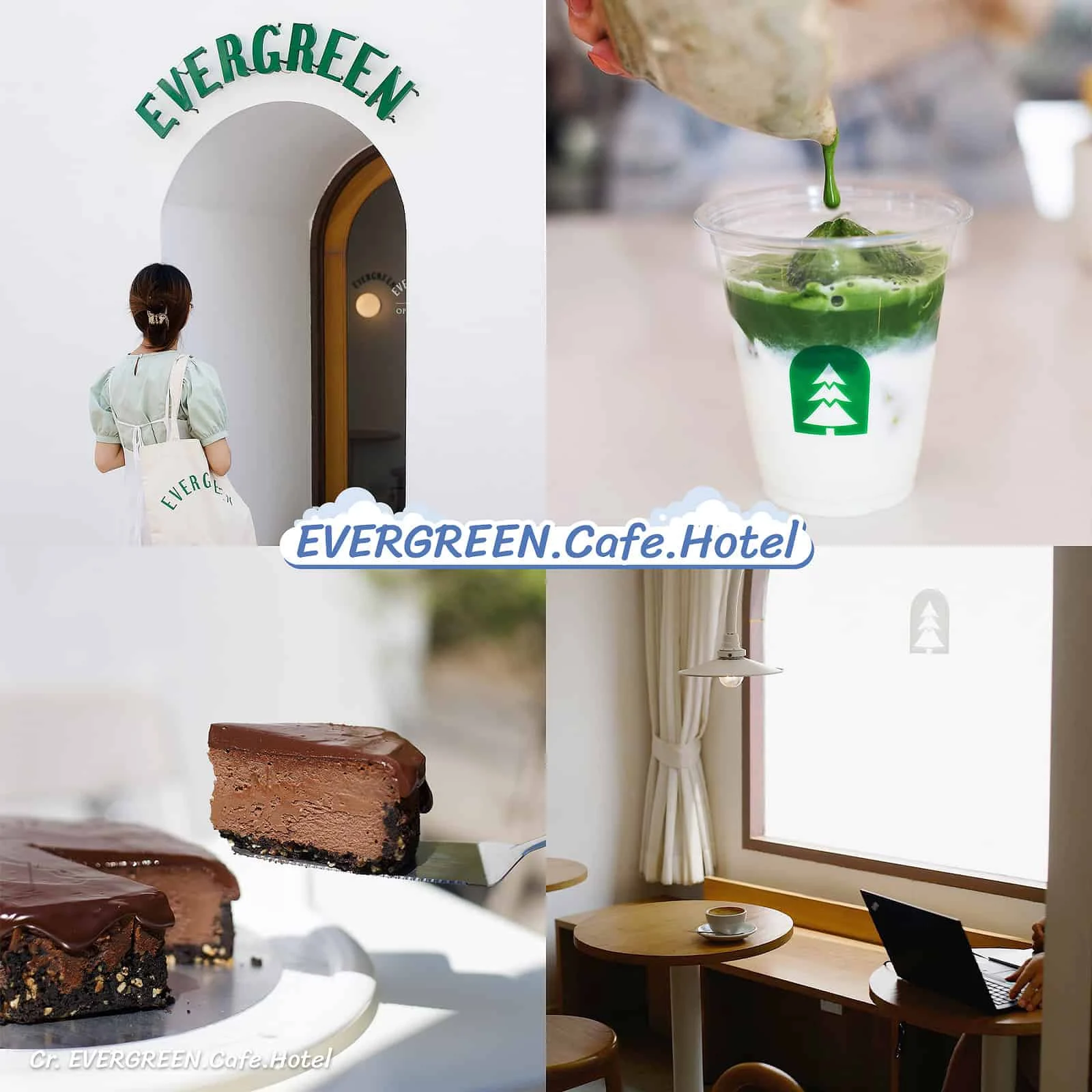EVERGREEN.Cafe.Hotel คาเฟ่มินิมอลแถวสวนดอก เป็นคาเฟ่เล็กๆ ตกแต่งด้วยโทนสีขาวตัดกับสีเขียวนิดๆ มีทั้งเมนู มัทฉะ (เน้นไปที่มัทฉะเลยจริงๆ) กาแฟ น้ำผลไม้ กลิ่นหอม สมราคา มีมุมให้ถ่ายรูปเยอะ