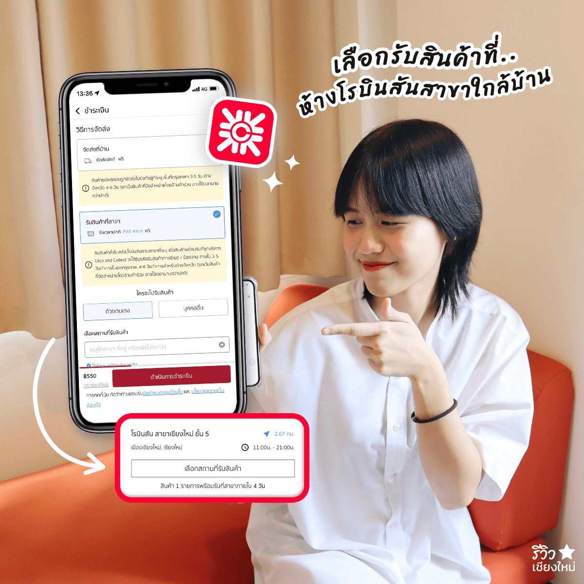 - เลือกวิธีการจัดส่งมี 2 แบบ คือ จัดส่งถึงบ้านหรือ รับสินค้าที่สาขา แอดกดเลือกรับสินค้าที่สาขา จากนั้นเลือกสาขา Robinson ใกล้บ้าน ฟรี! ค่าจัดส่ง