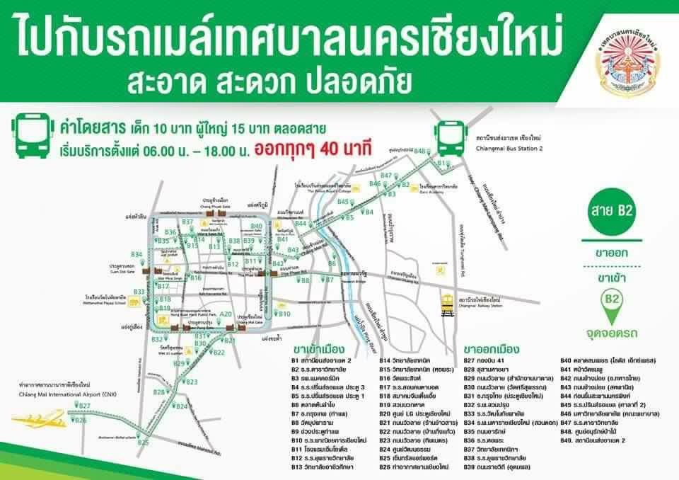 อัพเดทข้อมูล 30 มีนาคม 2559 ปัจจุบันได้มีการยกเลิกสาย 14 ไป และมีการเปลี่ยนแปลงเส้นทางเดินรถเป็น 2 สาย ดังนี้ สาย B1 (อาเขต – สถานีรถไฟ – ประตูท่าแพ – วัดพระสิงห์ – ตลาดต้นพยอม – หน้ามช. – สวนสัตว์) และ B2 (อาเขต – รร.ปริ้นส์ – ตลาดวโรรส – ประตูท่าแพ – ยุพราช – เซ็นทรัลแอร์พอร์ต – สนามบิน) รถออกทุกๆ 40 นาที ตั้งแต่เวลา 06.00 – 18.00 น. ค่าบริการเด็ก 10 บาทและผู้ใหญ่ 15 บาทตลอดสาย