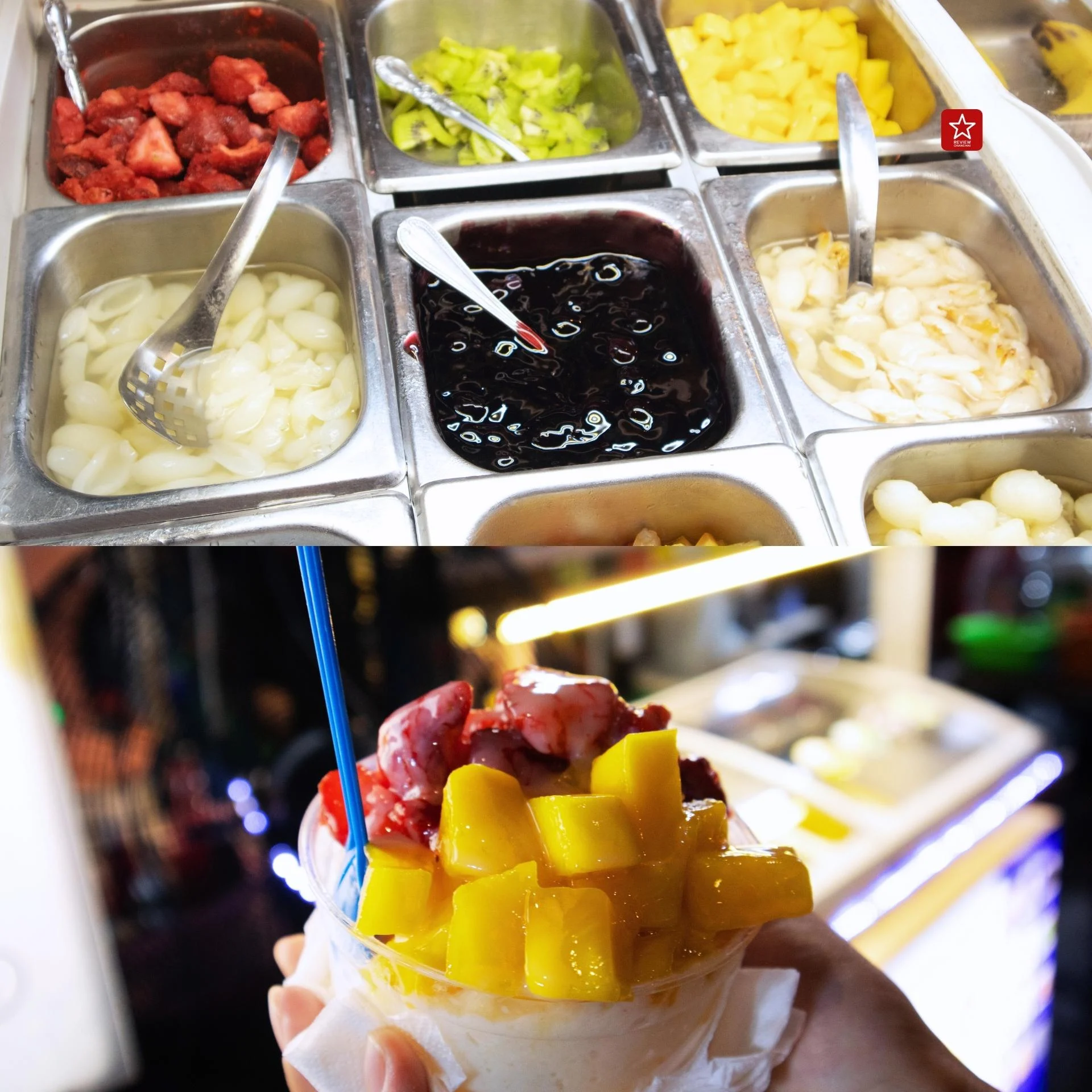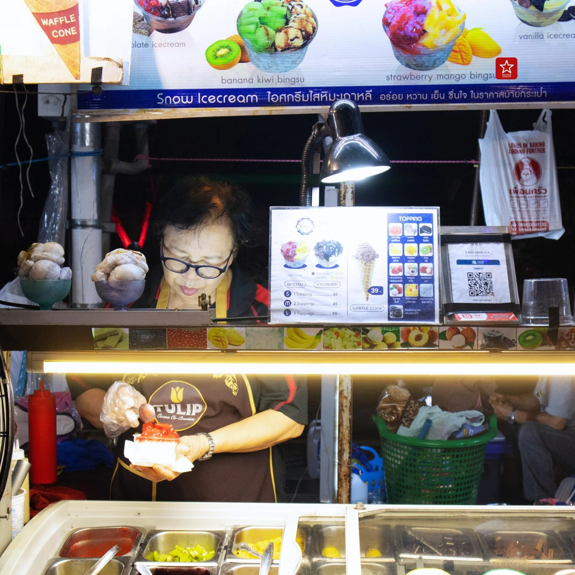 ร้านนี้มีทั้งไอศกรีมและบิงซู โดยจะมีท็อปปิ้งเป็นผลไม้ นานาชนิดให้เลือกใส่ โดยเราเองสั่งเป็นบิงซูสตรอว์เบอรรี่แมงโก้ เปรี้ยวหวานสะใจ ละลายความเหนื่อยเลย