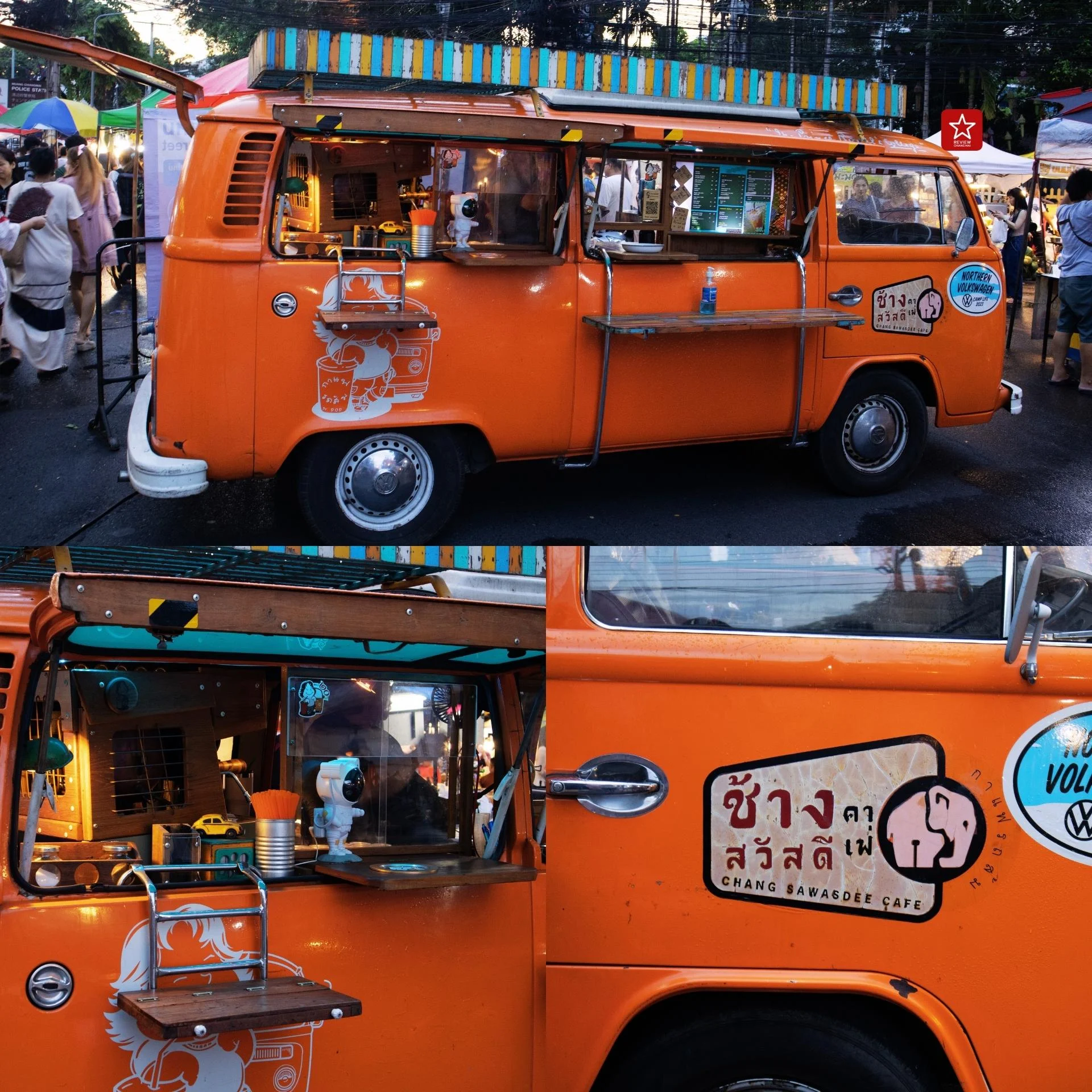 “ช้างสวัสดีคาเฟ่” ร้านกาแฟที่มาในรูปแบบรถส้มเจ้าเก่าเจ้าเดิม ประจำถนนคนเดินท่าแพก็ยังคงมีตั้งอยู่ที่ฟากเส้นถนน ฝั่งวัดพระสิงห์