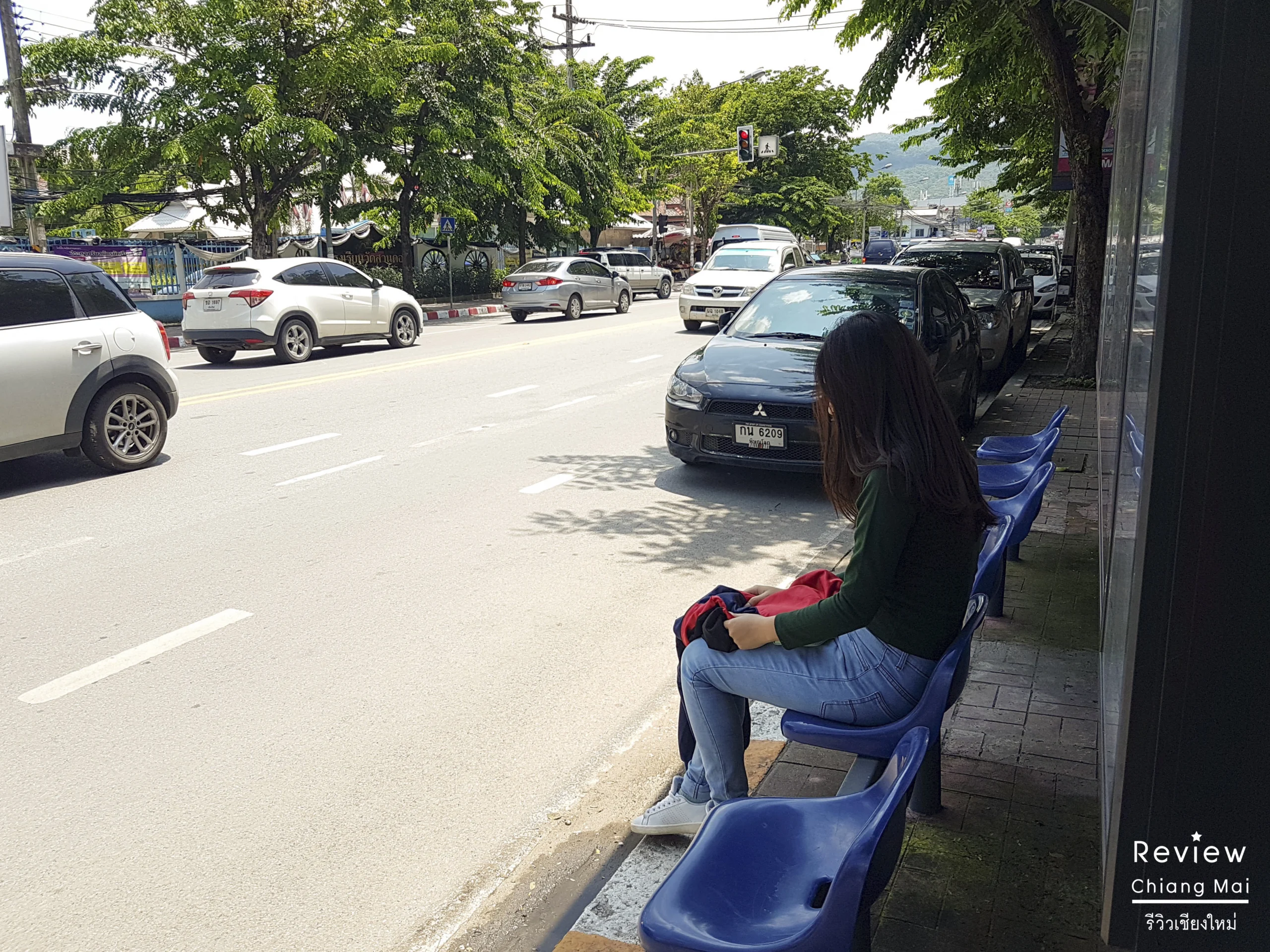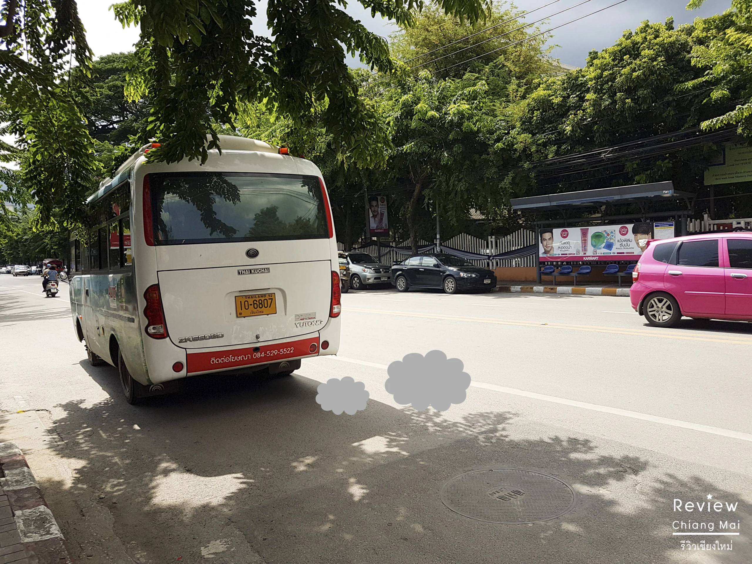 ไม่รอช้า GPS เห็นว่ารถกำลังเข้ามาใกล้เรา บิดมอไซค์ร้อยซาวไปยังป้ายรถเมล์ที่ใกล้ที่สุด เมื่อไปถึงก็พบว่า… รถเมล์หายไปต่อหน้าต่อตา เราช้าไปนิดเดียว เลยเดินข้ามถนนเพื่อไปรอรถเมล์ฝั่งตรงข้ามแทน ไม่นานเกินรอรถเมล์คันถัดไปก็มา
