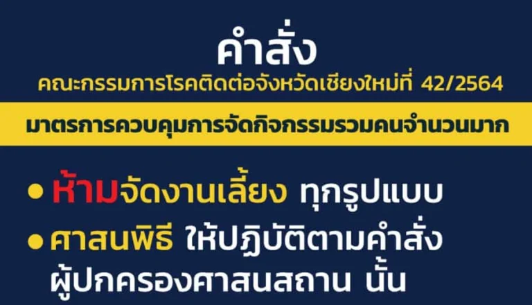 สรุปคำสั่ง คณะกรรมการโรคติดต่อจังหวัดเชียงใหม่ มีมติให้ออกคำสั่งคณะกรรมการโรคติดต่อจังหวัดเชียงใหม่ ที่ 42/2564 เรื่อง มาตรการควบคุมการจัดกิจกรรมรวมคนจำนวนมาก โดยมีสาระสำคัญ ดังนี้