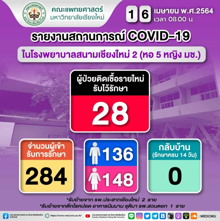 สถานการณ์โรงพยาบาลสนามเชียงใหม่ 2 มีผู้ป่วยรายใหม่ที่เข้ารับการรักษาตัวในโรงพยาบาลสนามเชียงใหม่ 2 หอหญิง 5 มช. จำนวน 28 ราย รวมจำนวนทั้งหมด มีผู้ป่วยรักษาตัว 284 ราย ในจำนวนนี้เป็นผู้ป่วยชาย 136 ราย และ ผู้ป่วยหญิง 148 ราย