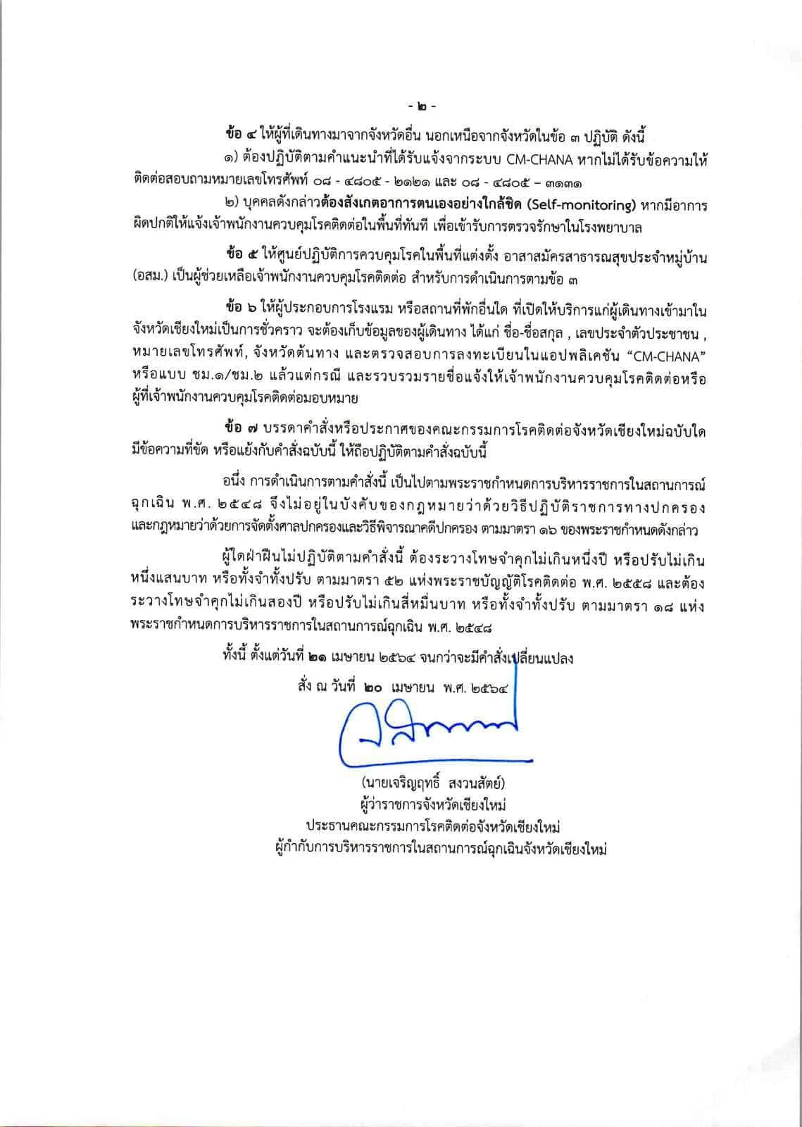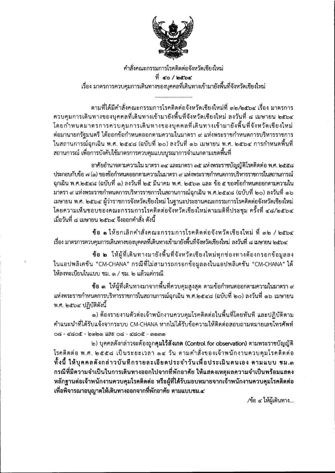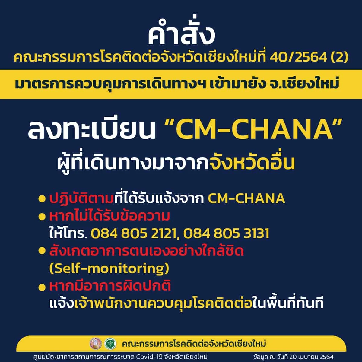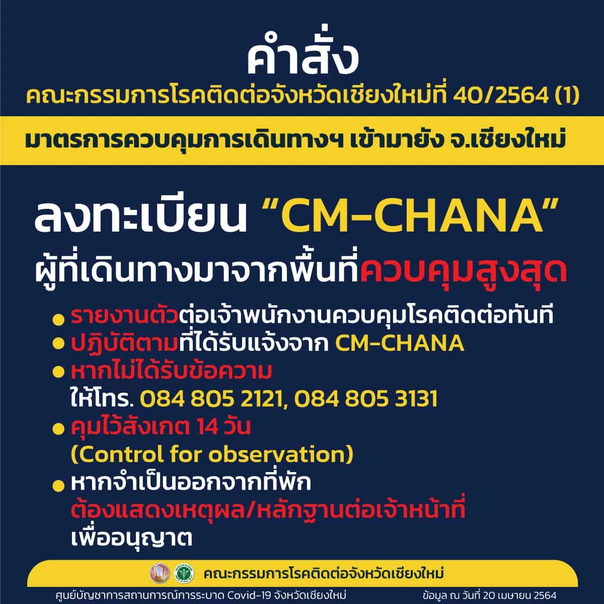 คณะกรรมการโรคติดต่อจังหวัดเชียงใหม่ มีมติให้ออกคำสั่งฯ ที่ 40/2564 เรื่อง มาตรการควบคุมการเดินทางของบุคคลที่เดินทางเข้ามายังพื้นที่จังหวัดเชียงใหม่ โดยมีสาระสำคัญของคำสั่ง ว่า ประการแรกผู้ที่เดินทางมายังพื้นที่จังหวัดเชียงใหม่ทุกช่องทาง ต้องกรอกข้อมูลลงในแอปพลิเคชัน “CM-CHANA” กรณีที่ไม่สามารถกรอกข้อมูลลงใน “CM-CHANA” ได้ ให้ลงทะเบียนในเอกสาร แบบ ชม.1 หรือ ชม. 2 แล้วแต่กรณี