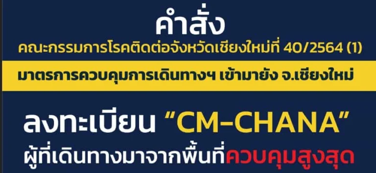 คณะกรรมการโรคติดต่อจังหวัดเชียงใหม่ มีมติให้ออกคำสั่งฯ ที่ 40/2564 เรื่อง มาตรการควบคุมการเดินทางของบุคคลที่เดินทางเข้ามายังพื้นที่จังหวัดเชียงใหม่ โดยมีสาระสำคัญของคำสั่ง ว่า ประการแรกผู้ที่เดินทางมายังพื้นที่จังหวัดเชียงใหม่ทุกช่องทาง ต้องกรอกข้อมูลลงในแอปพลิเคชัน “CM-CHANA” กรณีที่ไม่สามารถกรอกข้อมูลลงใน “CM-CHANA” ได้ ให้ลงทะเบียนในเอกสาร แบบ ชม.1 หรือ ชม. 2 แล้วแต่กรณี