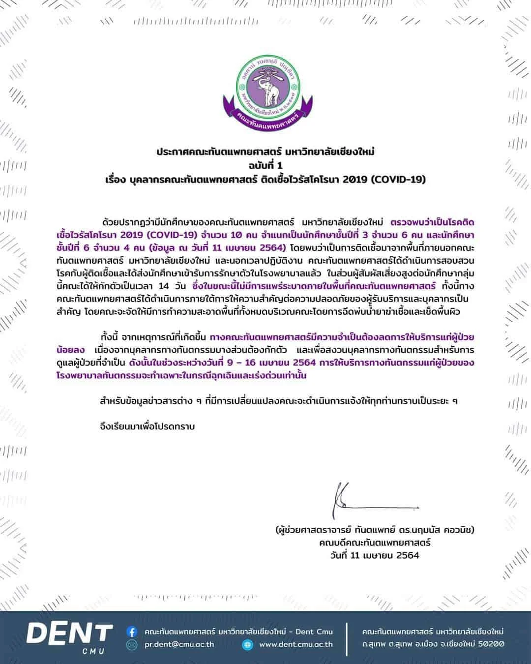 คณะทันตแพทยศาสตร์ มช. พร้อมในการป้องกันและช่วยเหลือ นศ.และบุคลากรคณะ ในสถานการณ์โควิด ด้วยปรากฏว่ามีนักศึกษาของคณะทันตแพทยศาสตร์ มหาวิทยาลัยเชียงใหม่ ตรวจพบว่าเป็นโรคติดเชื้อไวรัสโคโรนา 2019 (COVID-19) จำนวน 10 คน (ข้อมูล ณ วันที่ 11 เมษายน 2564)