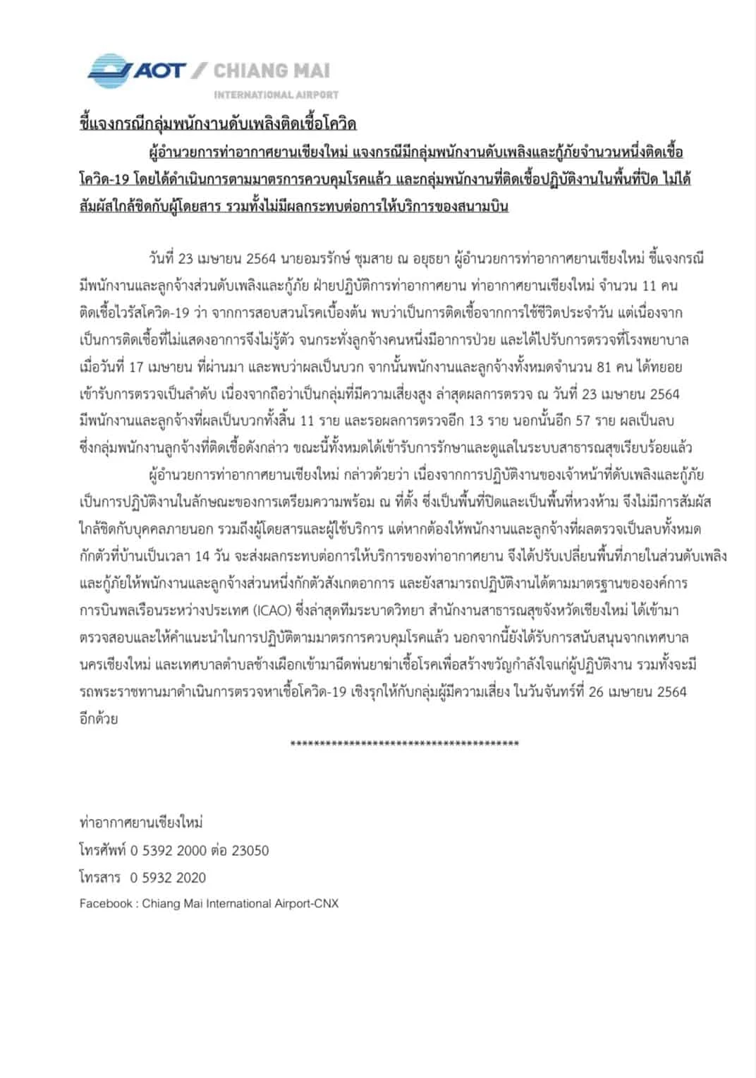 วันที่ 23 เมษายน 2564 นายอมรรักษ์ ชุมสาย ณ อยุธยา ผู้อำนวยการท่าอากาศยานเชียงใหม่ ชี้แจงกรณีมีพนักงานและลูกจ้างส่วนดับเพลิงและกู้ภัย ฝ่ายปฏิบัติการท่าอากาศยาน ท่าอากาศยานเชียงใหม่ จำนวน 11 คน ติดเชื้อไวรัสโควิด-19 ว่า จากการสอบสวนโรคเบื้องต้น พบว่าเป็นการติดเชื้อจากการใช้ชีวิตประจำวัน แต่เนื่องจากเป็นการติดเชื้อที่ไม่แสดงอาการจึงไม่รู้ตัว จนกระทั่งลูกจ้างคนหนึ่งมีอาการป่วย และได้ไปรับการตรวจที่โรงพยาบาล เมื่อวันที่ 17 เมษายน ที่ผ่านมา และพบว่าผลเป็นบวก จากนั้นพนักงานและลูกจ้างทั้งหมดจำนวน 81 คน ได้ทยอยเข้ารับการตรวจเป็นลำดับ เนื่องจากถือว่าเป็นกลุ่มที่มีความเสี่ยงสูง ล่าสุดผลการตรวจ ณ วันที่ 23 เมษายน 2564 มีพนักงานและลูกจ้างที่ผลเป็นบวกทั้งสิ้น 11 ราย และรอผลการตรวจอีก 13 ราย นอกนั้นอีก 57 ราย ผลเป็นลบ ซึ่งกลุ่มพนักงานลูกจ้างที่ติดเชื้อดังกล่าว ขณะนี้ทั้งหมดได้เข้ารับการรักษาและดูแลในระบบสาธารณสุขเรียบร้อยแล้ว