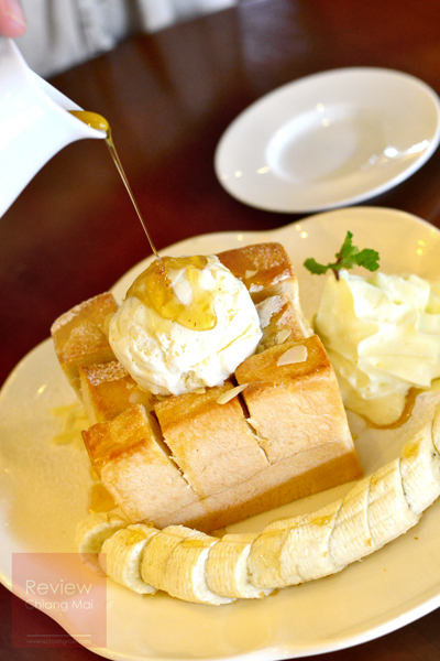 มาต่อกันที่ขนมหวาน อันเป็นเหตุให้เราต้องมารีวิวร้านนี้ มันช่างถูกใจผมและทีมงานเสียนี่กระไร จัดเต็มมาด้วยจานแรกนี้ก่อนเลย “Honey Toast with Ice cream” ขนมปังชิ้นหนาๆ กรอบนอกนุ่มใน ราดด้วยน้ำผึ้งฉ่ำๆ เสิร์ฟมาพร้อมกับไอศครีมวานิลลาและกล้วยหอมเต็มๆ จาน (เกือบ)อิ่มกันตั้งแต่จานแรก สนนราคาจานนี้เพียง 139 บาทเท่านั้นเอง