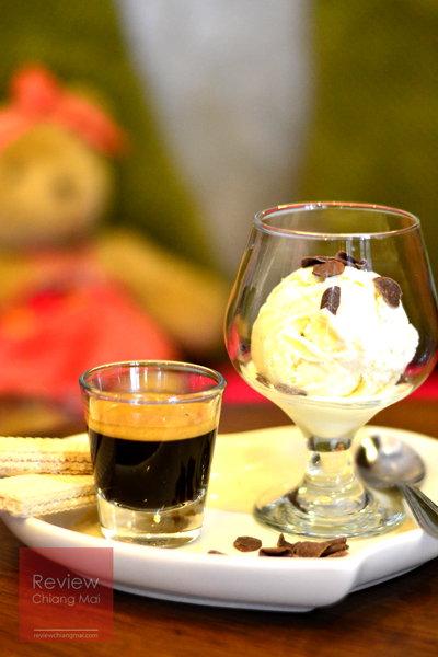 ของหวานเซ็ตสุดท้าย เรียกว่ามาแบบ “ทูอินวัน” ทั้งไอศครีมและกาแฟเสิร์ฟมาคู่กัน มีชื่อเรียกหล่อหรู ราวกับหนุ่มอิตาเลียน ว่า “Affogato” เป็นเมนูที่นิยมอย่างหนึ่งตามแบบฉบับของชาวอิตาลี ที่จะนำกาแฟเอสเปรสโซ่ 1 ช็อต มาราดลงบนไอศครีมวานิลลาแล้วรับประทาน ไอศครีมหวานตัดกับกาแฟขม อร่อยไปอีกแบบ ยิ่งถ้ากาแฟคุณภาพแบบนี้แล้ว คงไม่ต้องบรรยายว่าจะรสชาติดีเพียงใด เซ็ตนี้มีค่าตัว 89 บาทเท่านั้น หรือหากลูกค้าท่านใดที่ต้องการทานแต่ไอศครีมอย่างเดียว ก็สามารถเลือกสั่งได้ตามใจชอบ