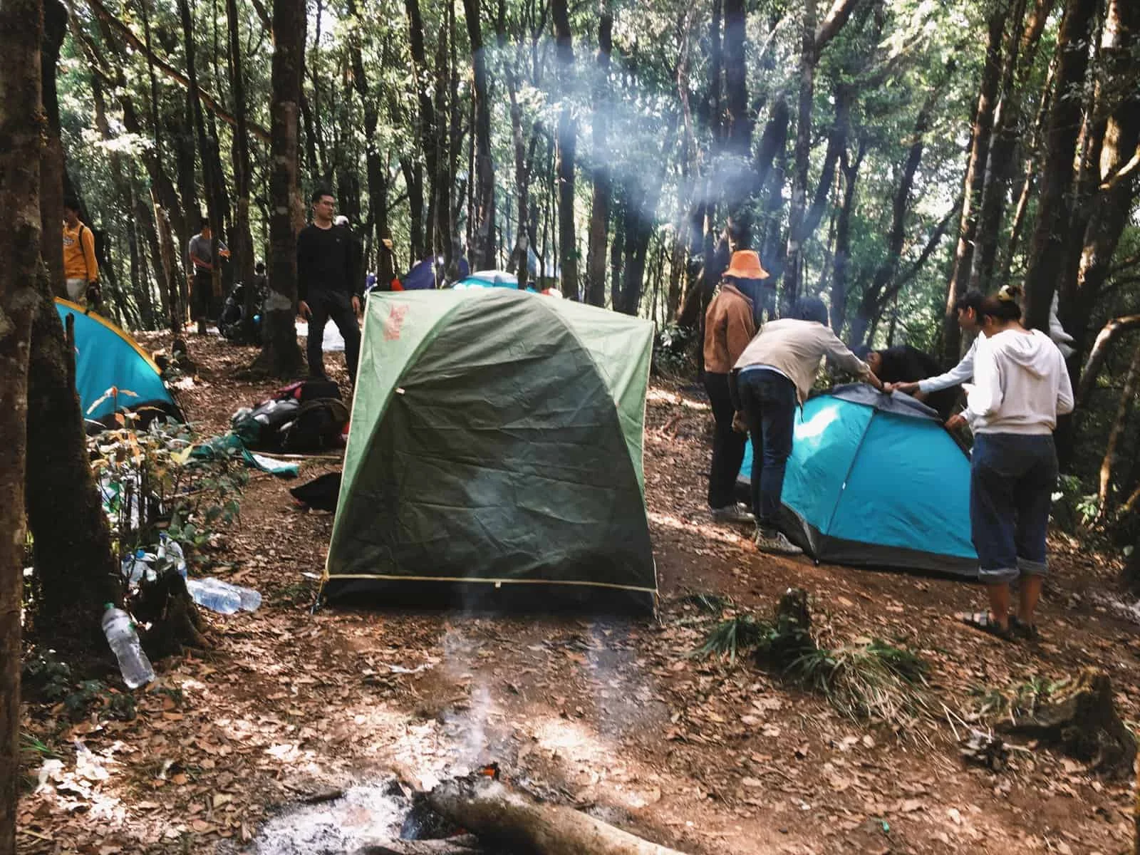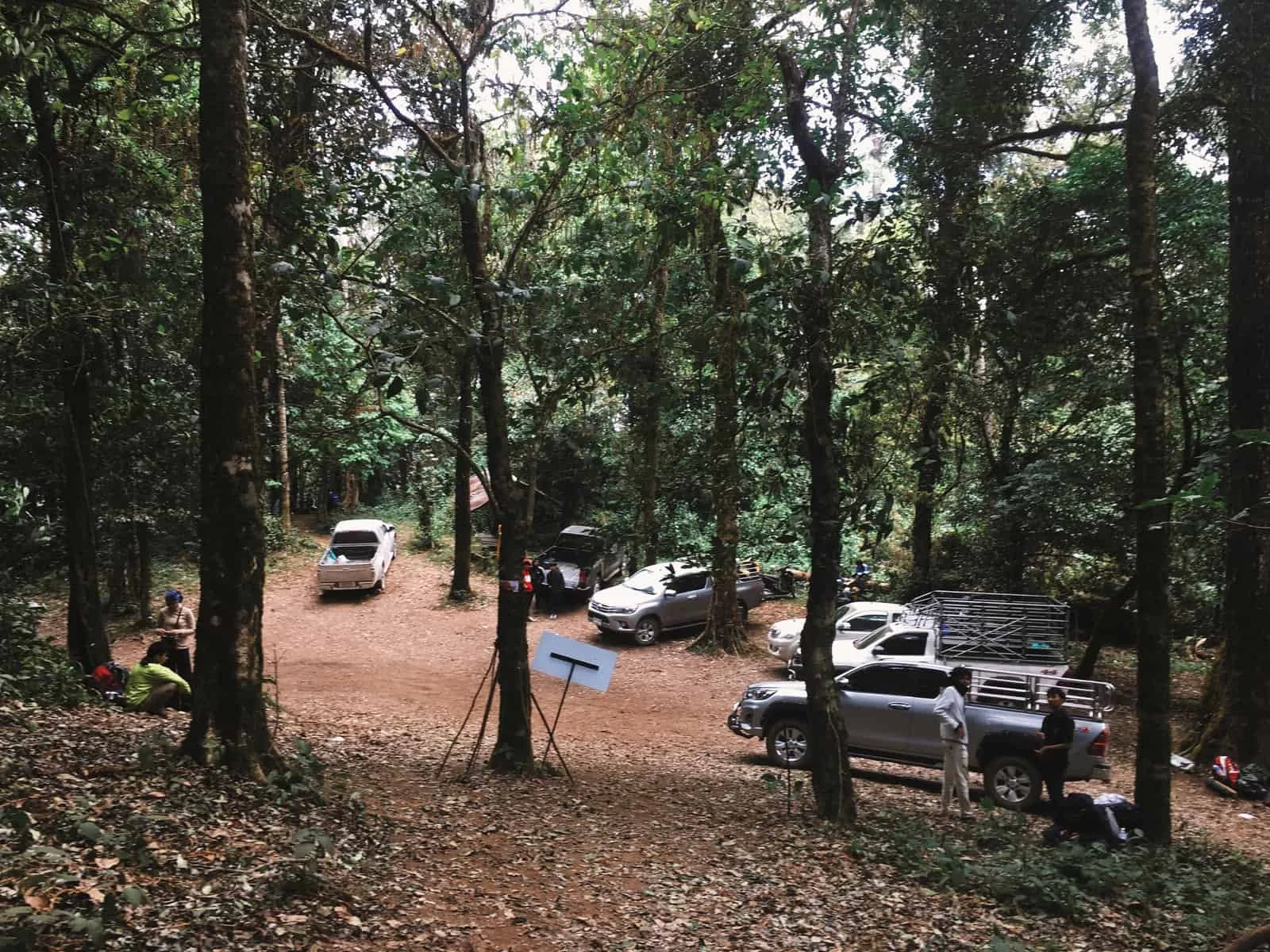 เดินไปเรื่อยๆ จะเจอป้ายบอกทางไปจุดกางเต็นท์ อยู่ซ้ายมือ มองหาลูกหาบไม่เจอ เลยไปถามเจ้าหน้าที่ โชคดีที่เจ้าหน้าที่จำลูกหาบเราได้ เลยเจอลูกหาบที่กำลังก่อไฟให้ ส่วนพวกเราก็เริ่มกางเต็นท์กัน