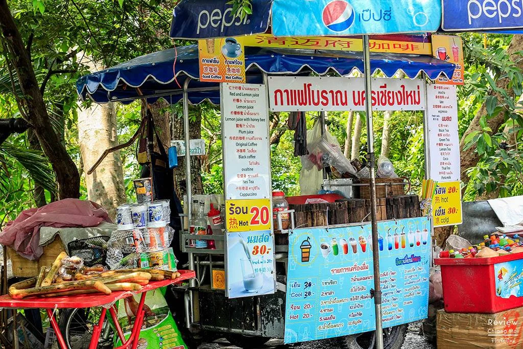 ต่อไปก็จะมาถึงบริเวณด้านหน้าวัดพระธาตุดอยสุเทพ บริเวณนี้จะมีพ่อค้าเเม่ค้าขายของฝาก ชุดม้งกันเต็มไปหมดเเต่ก็จะมีของกินเเซมๆ อยู่บ้าง พวกของปิ้งย่างเหมือนทั่วๆ ไป ร้านขายน้ำผลไม้ ร้านขายขนมครกเเละไข่นกกระทา เดินต่อไปเรื่อยๆ ก็เจอร้านกาเเฟที่นั่งกินตรงนั้นเเล้วแบบโคตรฟินเลย