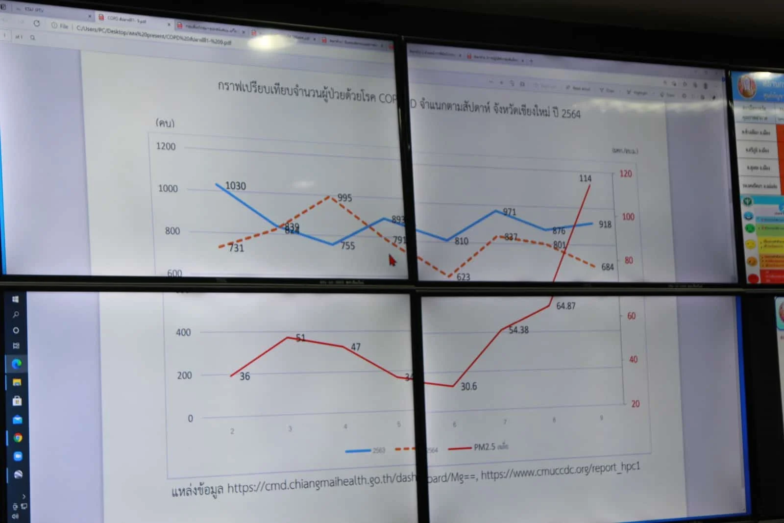 ด้านนายแพทย์จตุชัย มณีรัตน์ นายแพทย์สาธารณสุขจังหวัดเชียงใหม่ ได้ชี้แจงถึง สถิติผู้ป่วยโรคหลอดลมอุดกั้นเรื้อรัง หรือ COPD มีน้อยลงกว่าปีที่ผ่านมา เนื่องจากพบว่าประชาชนมีการสวมใส่หน้ากากอนามัยเพิ่มมากขึ้นจากสถานการณ์โควิด-19 และยังได้เตรียมเวชภัณฑ์ต่างๆ ไว้พร้อมรองรับผู้ป่วยที่ต้องเข้ารับการรักษาโรคเกี่ยวกับทางเดินหายใจที่เกิดจากฝุ่นละอองขนาดเล็ก PM2.5 ทั้งนี้ทางสาธารณสุขจังหวัดเชียงใหม่ได้ประสานกับโรงพยาบาลส่งเสริมสุขภาพตำบลสนับสนุนการตรวจสุขภาพเจ้าหน้าที่ที่ปฏิบัติการในพื้นที่ เพื่อความพร้อมและความปลอดภัยในการปฏิบัติงานอีกด้วย