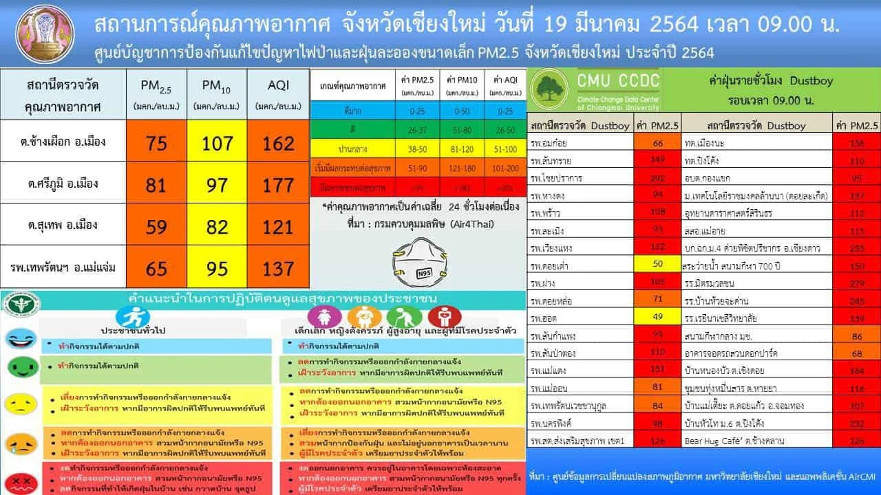 สำหรับค่าคุณภาพอากาศของจังหวัดเชียงใหม่ทั้ง 4 จุดหลักของกรมควบคุมมลพิษในวันนี้ค่าฝุ่นละอองขนาดเล็ก PM 2.5 ยังคงเกินค่ามาตรฐานที่ 59 – 81 ไมโครกรัมต่อลูกบาศก์เมตร และพบค่าฝุ่นละอองสูงสุดที่สถานีตรวจวัดโรงเรียนยุพราชวิทยาลัย ตำบลศรีภูมิ อำเมือง จังหวัดเชียงใหม่ โดยมีปริมาณฝุ่นละอองอยู่ที่ 81 ไมโครกรัมต่อลูกบาศก์เมตร ซึ่งอยู่ในเกณฑ์ที่เริ่มมีผลกระทบต่อสุขภาพของประชาชน โดยทางคณะทำงานฯ ได้สั่งให้องค์กรปกครองส่วนท้องถิ่นควบคุมจุดความร้อนที่เกิดขึ้นในพื้นที่ไม่ให้ลุกลาม และดำเนินการเพิ่มความชุ่มชื้นในระดับผิวพื้น พร้อมจัดเตรียม Safety Zone และแจกหน้ากากอนามัยชนิดที่สามารถป้องกันฝุ่นละอองขนาดเล็กให้กับประชาชนในกลุ่มเสี่ยง