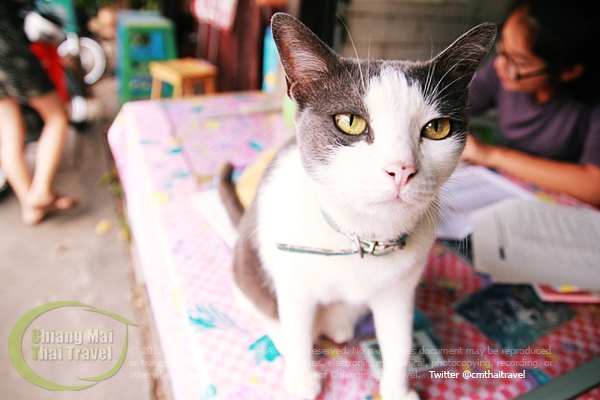 ร้านนี้จะมีเจ้าแมวอยู่ตัวนึง นิสัยมันประหลาดมากคือชอบจ้องหน้าคน คือถ้าหันไปจ้องหน้ามัน มันจะหันมามองสู้ จะไม่หันกลับจนกว่าเราจะเลิกมอง ในภาพนี้สู้กล้องมาก เรียกว่าจ้องแบบไม่กระพริบ