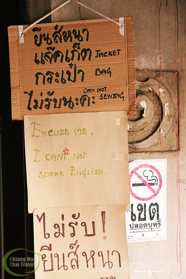 ร้านนี้ชื่อ ร้านป้าปิ่น เจอหน้าแกครั้งแรก อัธยาศัยดีมาก แกติดป้ายหน้าร้านชัดเจนไม่รับซ่อมยีนส์ แต่ผมหน้าด้านครับ ขี้เกียจไปไกลแล้ว ไปขอแกช่วยหน่อย แกก็ไม่ปฏิเสธนะ พูดอ้อมแอ้มว่าป้าขอ 1 วันแล้วกัน ป.ล.เดาได้เลยว่าจากภาพนี้คงมีลูกค้าภาษาอังกฤษมาขอซ่อมผ้าที่ร้านเยะมาก ถึงพูดไม่ได้ แต่ซ่อมได้นะฮะ