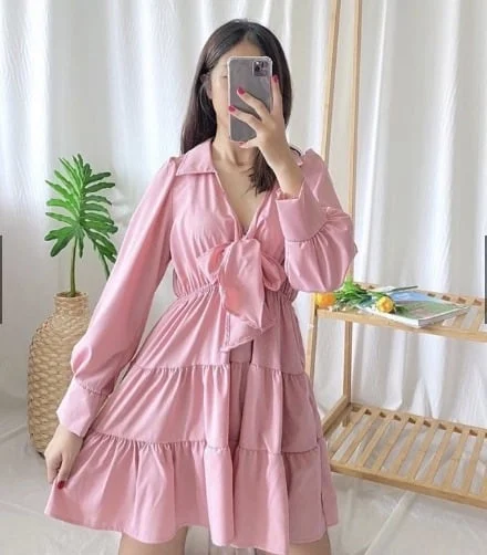 No.4 เดรสคอปก ผูกโบว์หน้า คิ้วๆ มินิเดรส เสื้อดูเกาหลี ดูไปทะเล