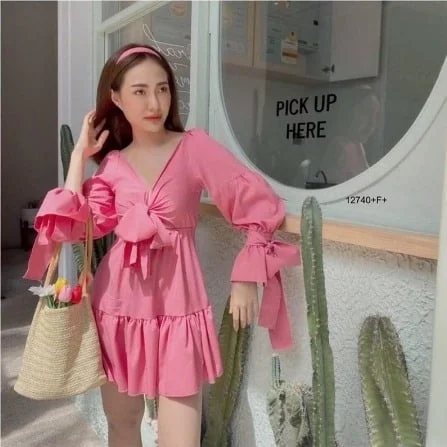 No.9 เดรสผูกหลัง เดรสบาร์บี้ เดรสโบว์หลัง มินิเดรสสั้น แขนตุ๊กตา