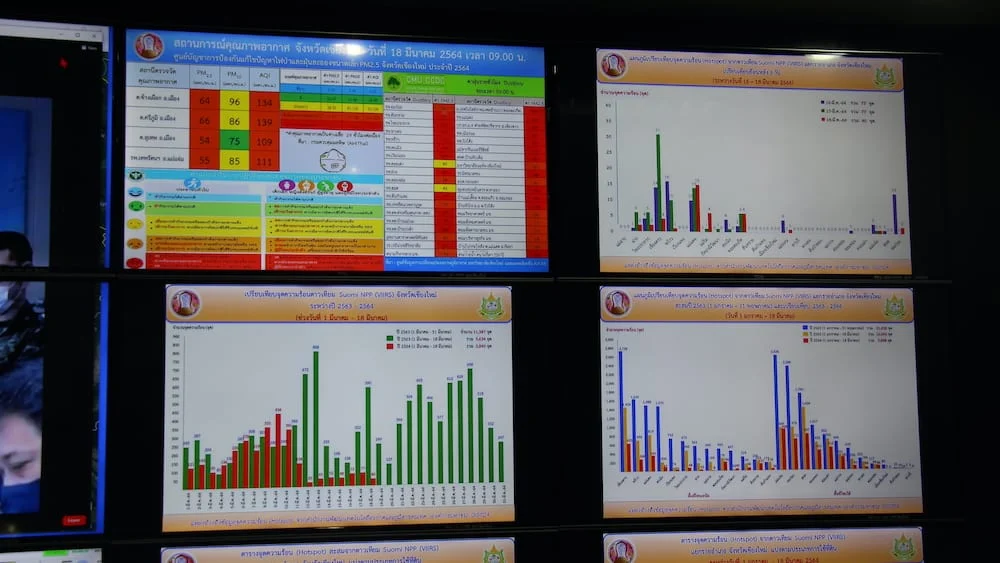 สำหรับค่าคุณภาพอากาศของจังหวัดเชียงใหม่ในเช้าวันนี้ พบว่า ทั้ง 4 จุดหลักของกรมควบคุมมลพิษยังคงกินค่ามาตรฐานที่ 53 -67 ไมโครกรัมต่อลูกบาศก์เมตร และพบมากที่สุดที่สถานีตรวจวัดโรงเรียนยุพราชวิทยาลัย ตำบลศรีภูมิ อำเมือง จังหวัดเชียงใหม่ โดยมีปริมาณฝุ่นละอองอยู่ที่ 67 ไมโครกรัมต่อลูกบาศก์เมตร ซึ่งอยู่ในเกณฑ์ที่เริ่มมีผลกระทบต่อสุขภาพของประชาชน ขณะที่สภาพอากาศในช่วง 1-3 วันข้างหน้า ความเข้มข้นของฝุ่น PM 2.5 ยังคงอยู่ในเกณฑ์สีส้ม ซึ่งจะต้องเฝ้าระวังในเรื่องของแหล่งกำเนิดในพื้นที่ต้นลมอย่างใกล้ชิด ส่วนการคาดการณ์โอกาสของการเกิดพายุฝน/พายุฤดูร้อน จากดัชนีอุตุนิยมวิทยา พบว่าระหว่างวันที่ 21-22 มีนาคม 2564 มีโอกาสสูงกว่า 50 เปอร์เซ็นต์ ที่จะเกิดพายุฤดูร้อน และมีการกระจายของฝน โดยเฉพาะในโซนอำเภอทางใต้ ซึ่งจะทำให้มีการระบายอากาศที่ดีขึ้น และช่วยระบายฝุ่นที่สะสมมาอย่างต่อเนื่องได้