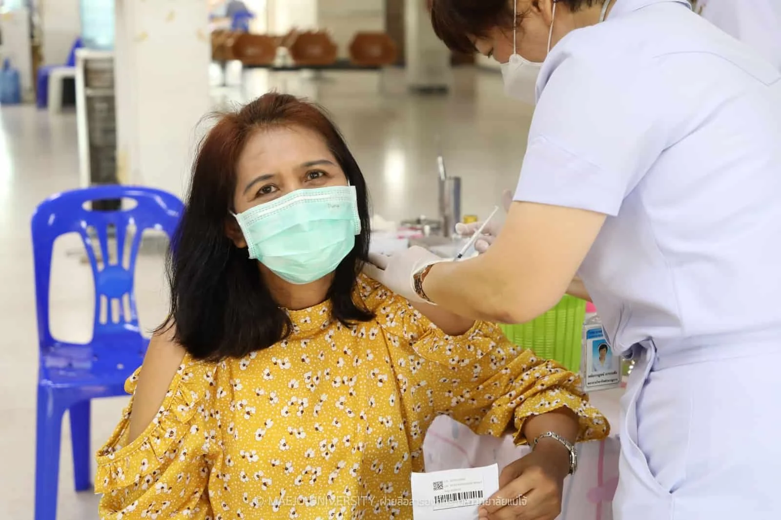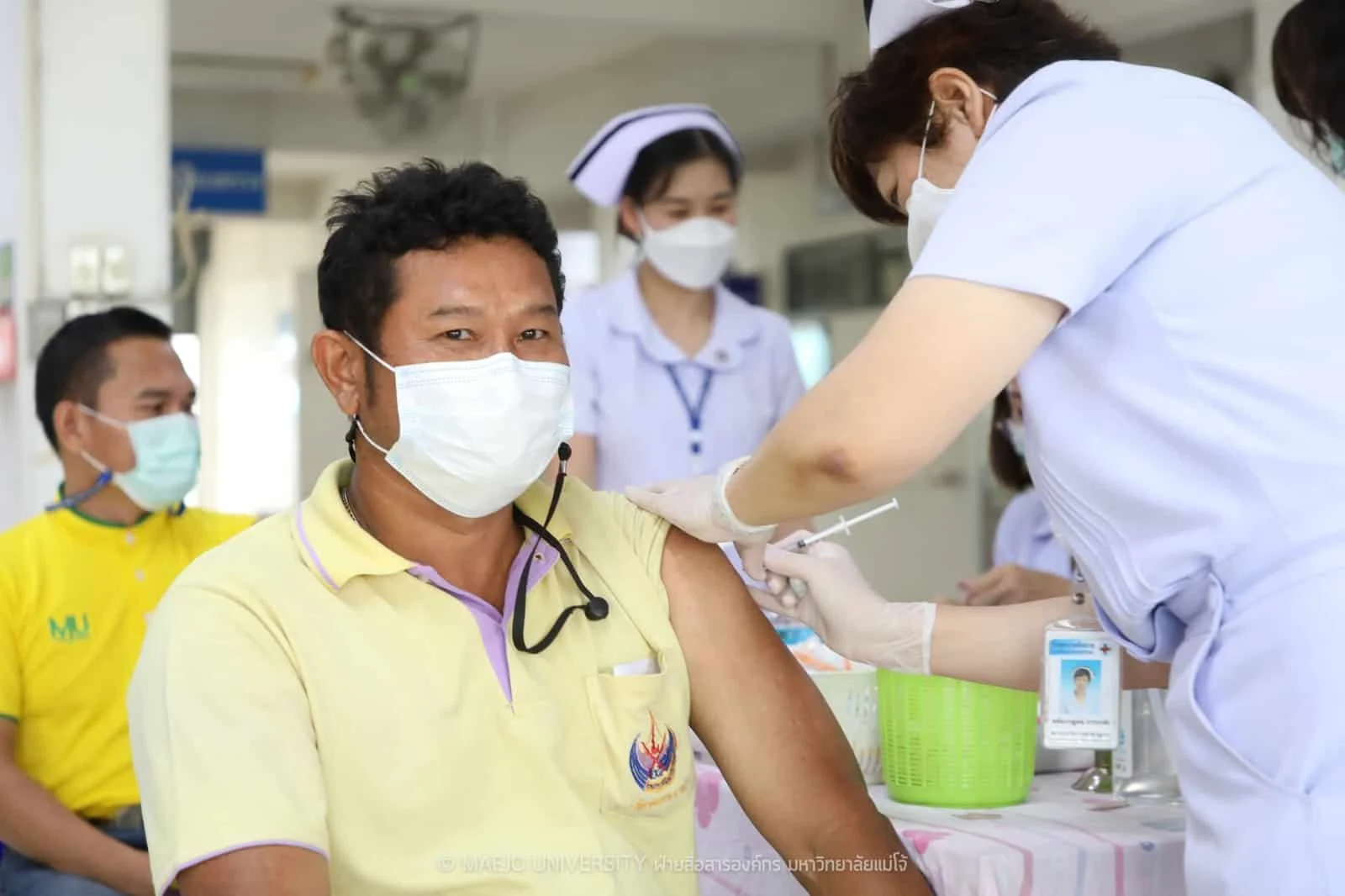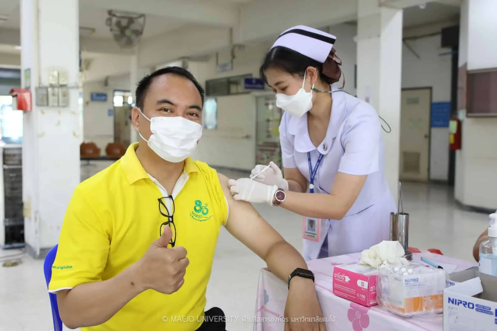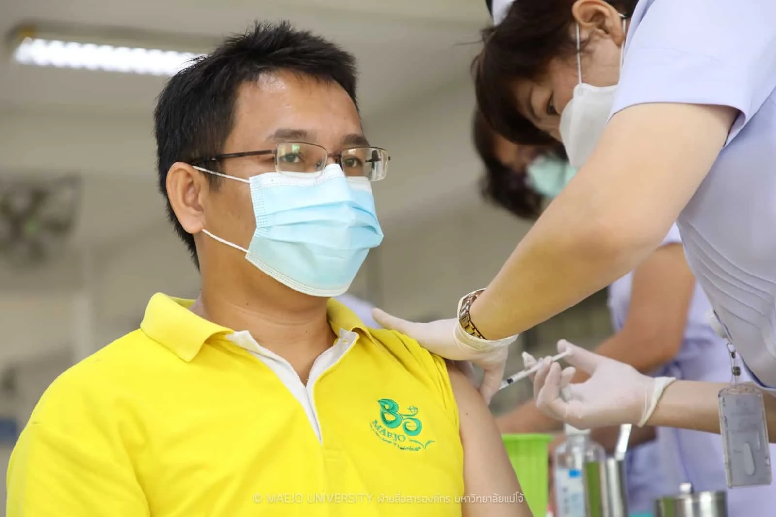 เข้ารับวัคซีนโควิด-19 วันจันทร์ที่ 26 เมษายน 2564 รองศาสตราจารย์ ดร.วีระพล ทองมา อธิการบดีมหาวิทยาลัยแม่โจ้ นำคณะผู้บริหาร และบุคลากรที่ทำงานส่วนหน้า โรงพยาบาลสนาม มหาวิทยาลัยแม่โจ้ ซึ่งเป็นเจ้าหน้าที่ที่เกี่ยวข้องกับการ