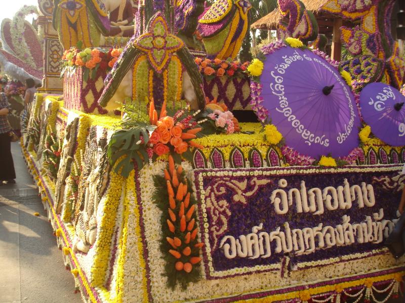 เริ่มจากรถของอำเภอดอยสะเก็ด ที่ได้ยินมาว่า ส่งประกวดเมื่อไหร่ ก็ชนะทุกปี ปีนี้ เค้าเลยจัดมาโชว์เฉยๆ ไม่ส่งเข้าประกวด เพื่อที่คนอื่นๆ จะได้ชนะบ้าง (ล่ะมั๊ง ^^) และพอเห็นรถของเค้า ก็ทำให้เข้าใจเลยว่า ทำไมถึงชนะได้ทุกปี เพราะมีความสร้างสรรค์ ละเอียดและประณีตมากๆ ดูได้จากการจัดเรียงเมล็ดพืช และการนำเศษดอกไม้ชิ้นเล็กๆ (ขอบอกว่าเล็กม๊าก….) มาเรียงกันให้ได้เป็นรูปเป็นร่างขึ้นมา