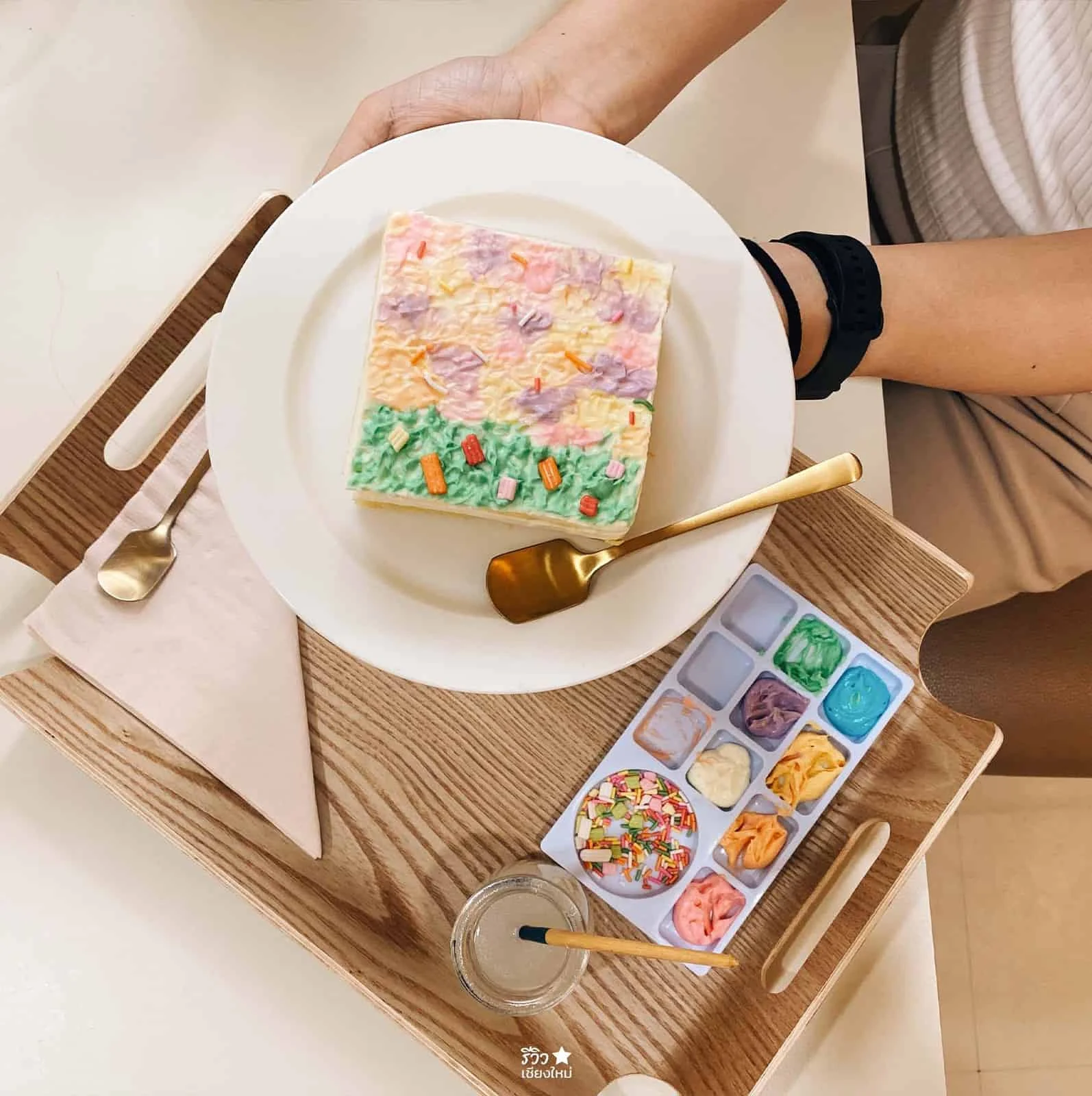 ตัวเค้กเป็นชิฟฟ่อนนมสด ในราคา 160 บาท สำหรับนั่งเพ้นท์ที่ร้าน ส่วนใครอยากเพ้นท์ที่บ้าน ทางร้านก็จัดให้ได้ ในราคา 190 บาท