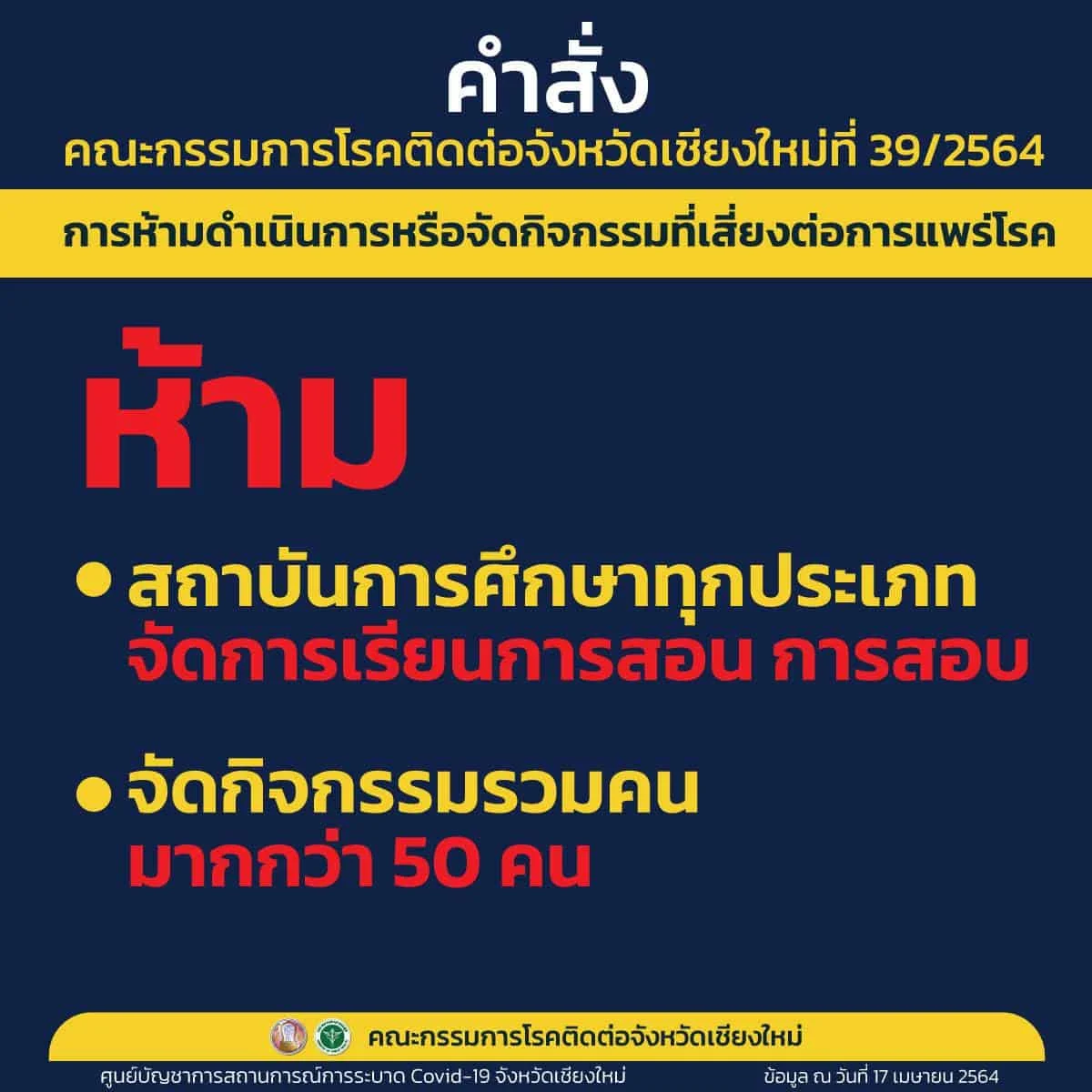 สำหรับคำสั่งฉบับที่สามจากมติการประชุมวันนี้ คือ คำสั่งคณะกรรมการโรคติดต่อจังหวัดเชียงใหม่ ที่ 39/2564 เรื่อง การห้ามดำเนินการหรือจัดกิจกรรมที่เสี่ยงต่อการแพร่โรค ซึ่งมีสาระสำคัญ ดังนี้