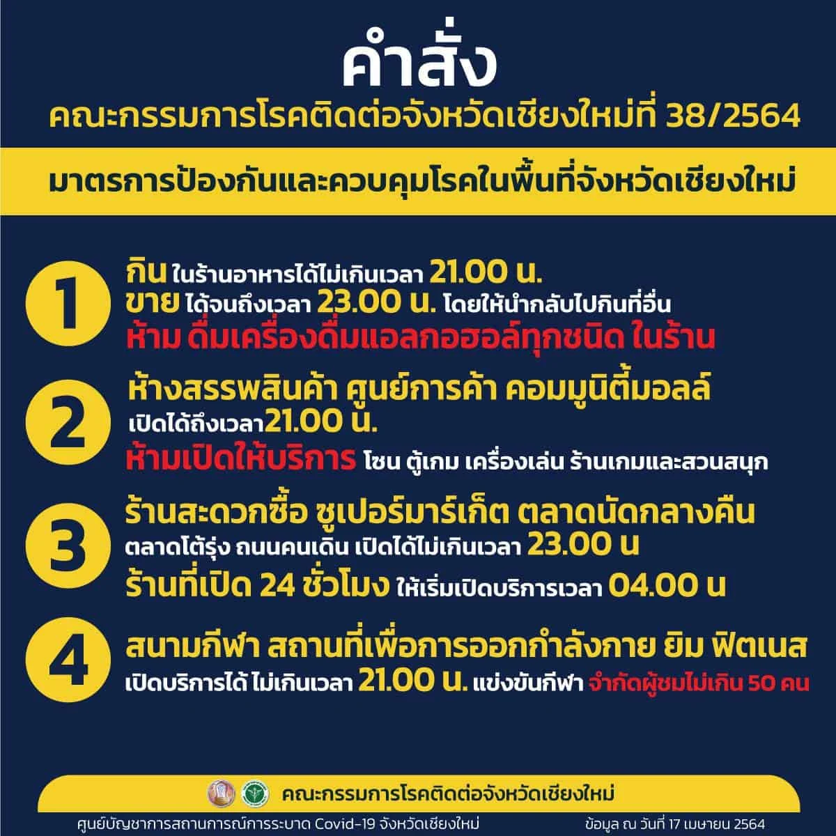 คำสั่งคณะกรรมการโรคติดต่อจังหวัดเชียงใหม่ เชียงใหม่รับลูก ศบค. ผุดอีก 3 คำสั่ง ขยายเวลาปิดสถานบริการไปจนถึง 30 เม.ย. ร้านอาหารกินในร้านได้แค่ 3 ทุ่ม ยังห้ามดื่มเหล้าในร้าน ห้างสรรพสินค้าฯ ต่างๆ ปิดในเวลา 21.00 น. ร้านสะดวกซื้อ โต้รุ่ง เปิดได้ถึง 5 ทุ่ม สถานบันการศึกษางดการเรียนการสอน ส่วนกิจกรรมรวมคนจัดได้ไม่เกิน 50 คน