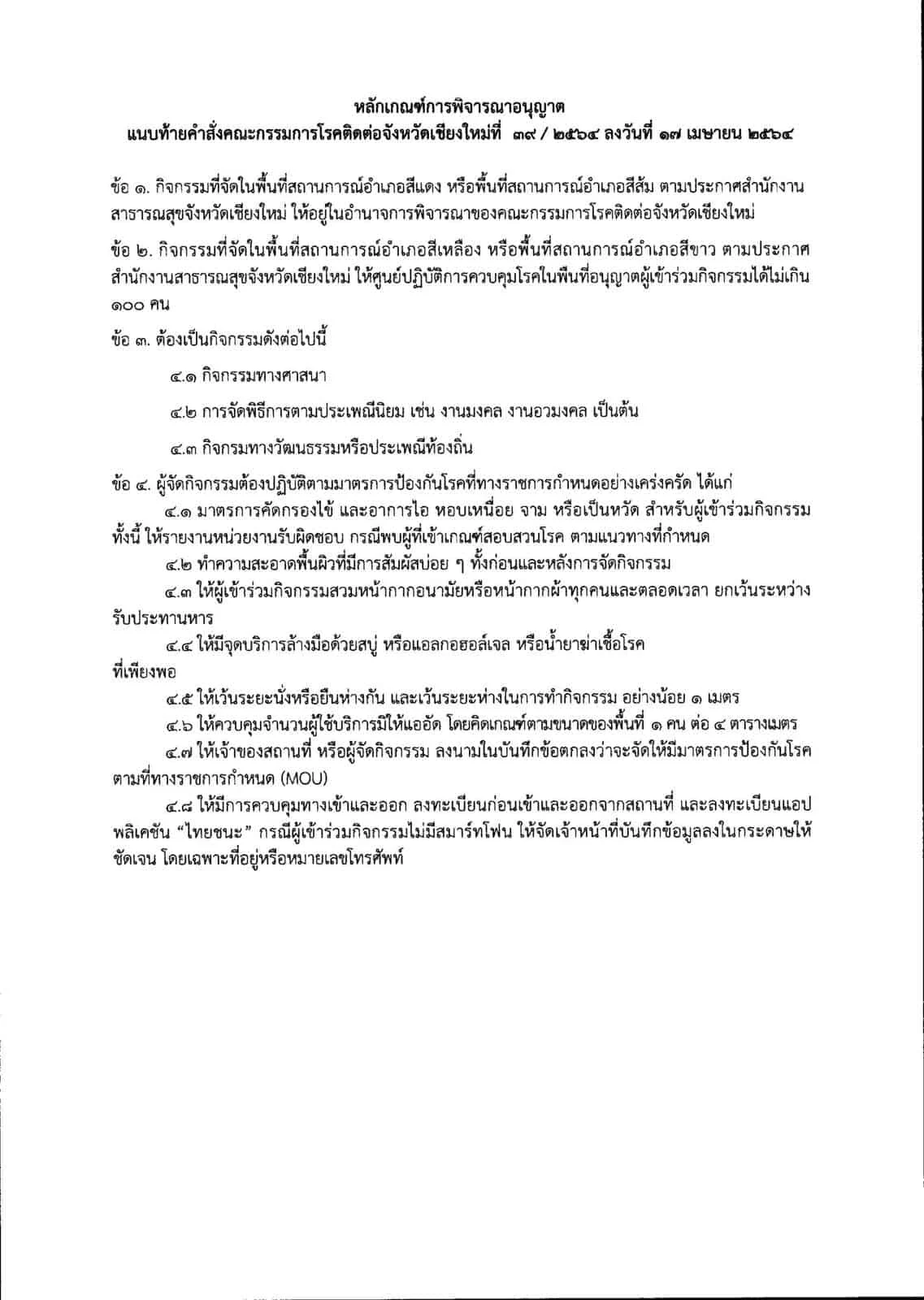 2 ห้ามการจัดกิจกรรมรวมกลุ่มมากกว่า 50 คน เว้นจะได้รับอนุญาตจากคณะกรรมการโรคติดต่อจังหวัดเชียงใหม่