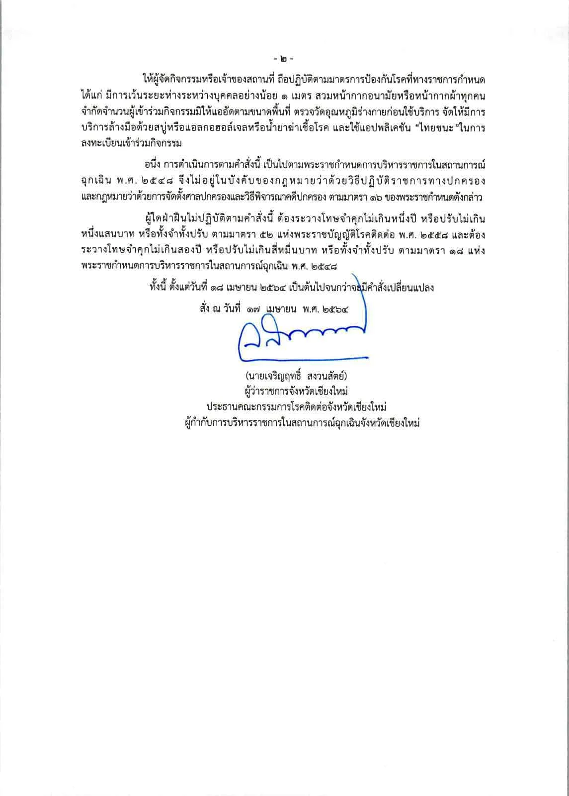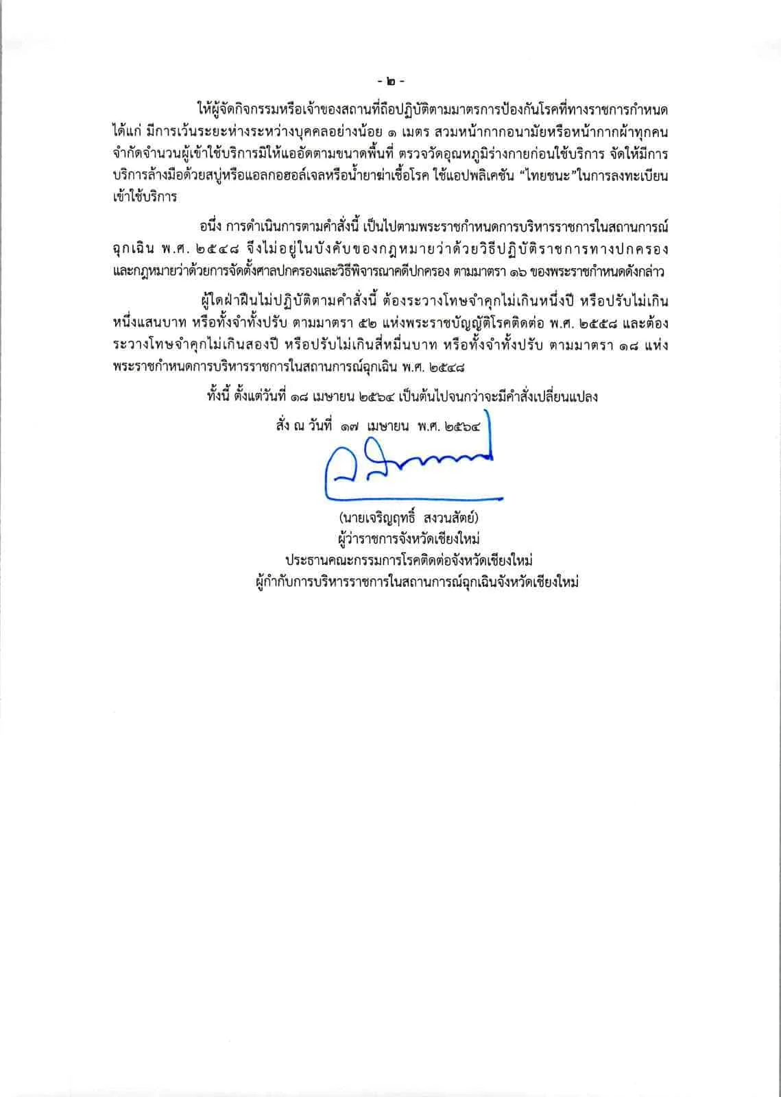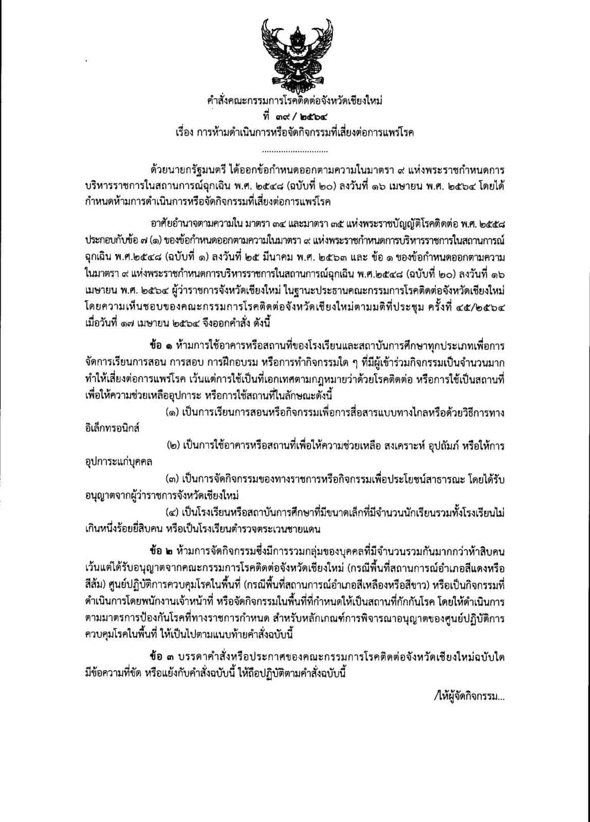คำสั่งคณะกรรมการโรคติดต่อจังหวัดเชียงใหม่ เชียงใหม่รับลูก ศบค. ผุดอีก 3 คำสั่ง ขยายเวลาปิดสถานบริการไปจนถึง 30 เม.ย. ร้านอาหารกินในร้านได้แค่ 3 ทุ่ม ยังห้ามดื่มเหล้าในร้าน ห้างสรรพสินค้าฯ ต่างๆ ปิดในเวลา 21.00 น. ร้านสะดวกซื้อ โต้รุ่ง เปิดได้ถึง 5 ทุ่ม สถานบันการศึกษางดการเรียนการสอน ส่วนกิจกรรมรวมคนจัดได้ไม่เกิน 50 คน