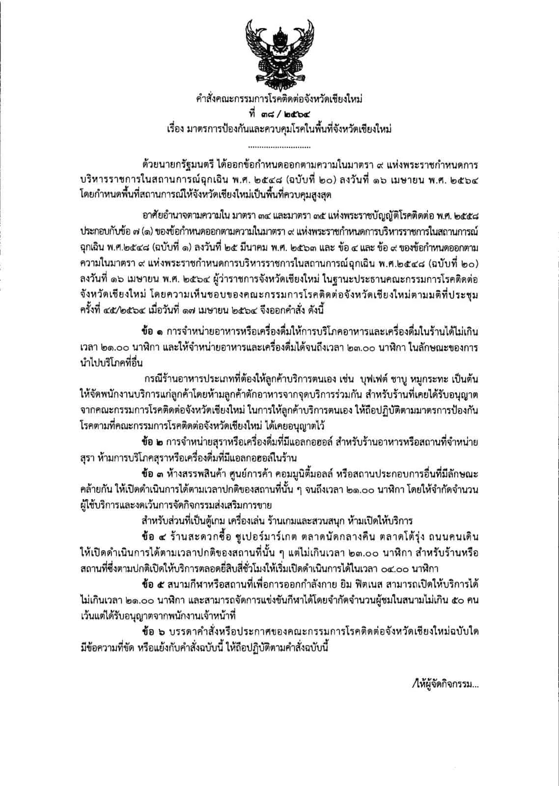 ส่วนอีกคำสั่งเป็น คำสั่งคณะกรรมการโรคติดต่อจังหวัดเชียงใหม่ ที่ 38/2564 เรื่อง มาตรการป้องกันและควบคุมโรคในพื้นที่จังหวัดเชียงใหม่ เป็นเรื่องการให้ปิดร้านอาหาร การจำกัดการดื่มเครื่องดื่มแอลกอฮอล์ และกำหนดเวลาปิดสถานที่บางกิจการ โดยมีสาระสำคัญ ดังนี้