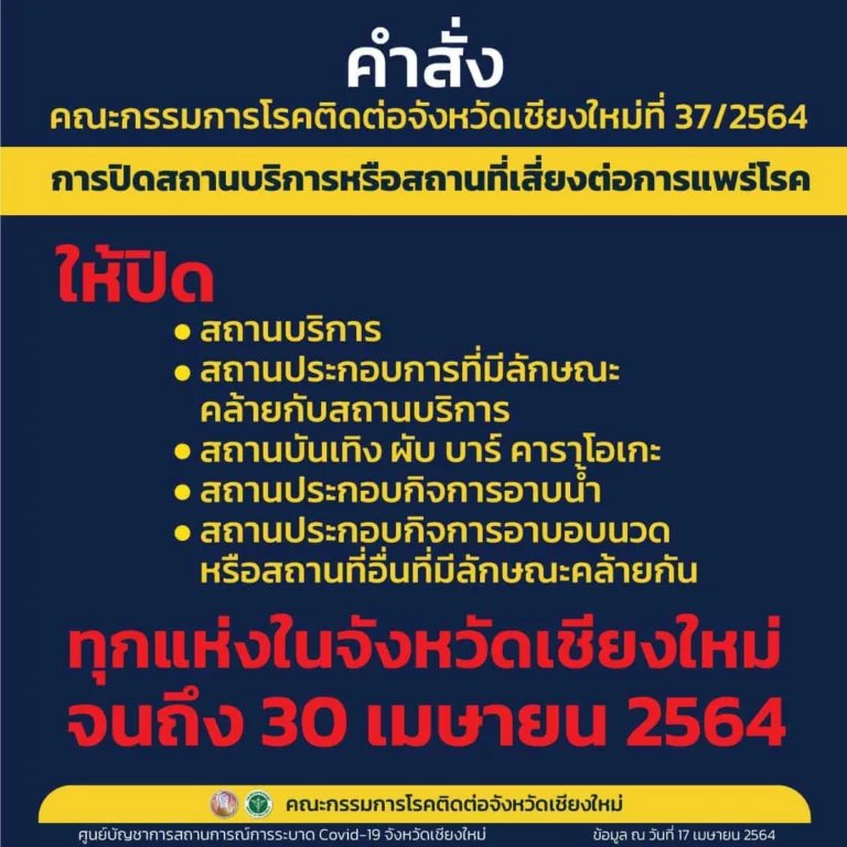 โดยฉบับแรกเป็น คำสั่งคณะกรรมการควบคุมโรคติดต่อจังหวัดเชียงใหม่ที่ 37/2564 เรื่อง การปิดสถานบริการหรือสถานที่เสี่ยงต่อการแพร่โรค โดยสั่งให้ ปิดสถานบริการ สถานประกอบการที่มีลักษณะคล้ายกับสถานบริการ สถานบันเทิง ผับ บาร์ คาราโอเกะ สถานประกอบกิจการอาบน้ำ สถานประกอบกิจการอาบอบนวด หรือสถานที่อื่นที่มีลักษณะคล้ายกัน ทุกแห่งในจังหวัดเชียงใหม่ ต่อเนื่องไปจนถึงวันที่ 30 เมษายน 2564