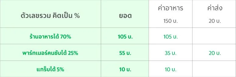 - รายการอาหารที่สั่ง 100 บาท หัก ค่า GP 30% = แอปฯ มีรายได้ 30 บาท