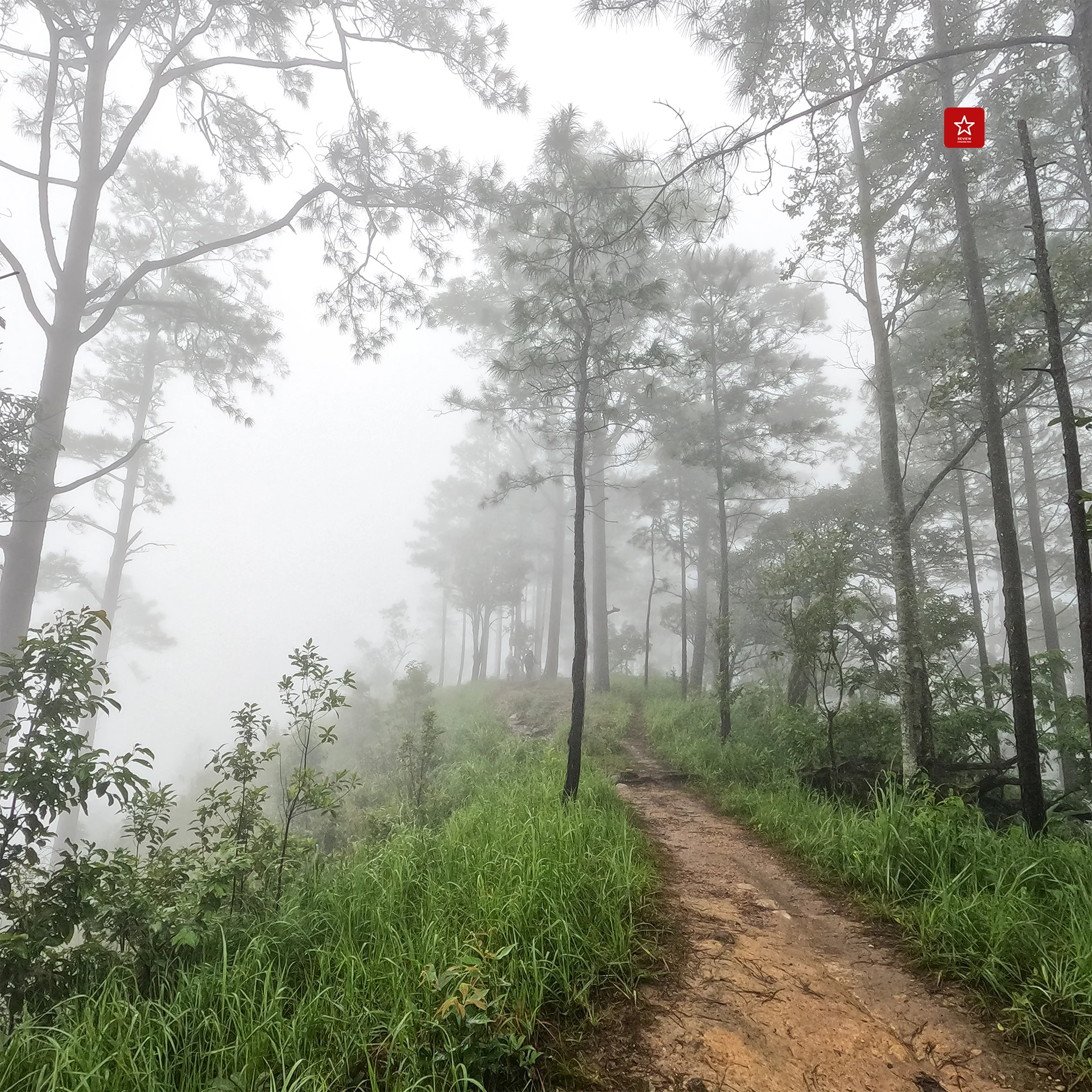 จากศาลาพัก เราเดินผ่านฝ่าสายหมอกไปยังจุดชมทิวทัศน์ยอดดอยหัวหมู แม้ในวันนี้จะมองไม่เห็นวิวทิวเขา แต่ความงามสีเทาของหมอกหนาที่กั้นเป็นฉากบังก็งดงามแตกต่างกันจากวันที่ฟ้าใส
