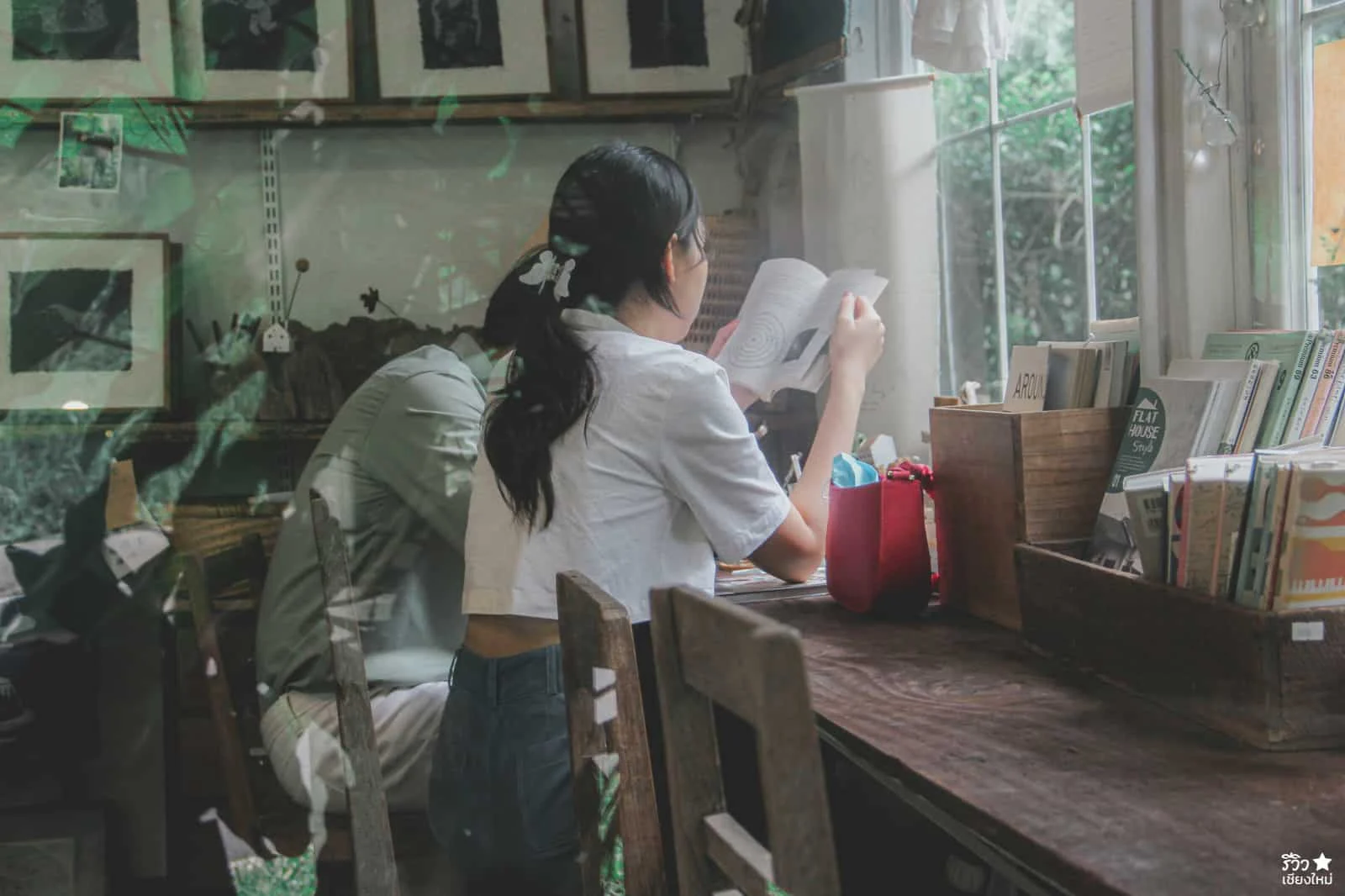 ภายในร้านก็จะมีเคาท์เตอร์ บาร์ ที่สามารถนั่งได้ประมาณ 3-4 คน และเป็นมุมยอดฮิตที่เอาไว้ถ่ายรูปแบบแกล้งๆ อ่านหนังสือ แล้วมีแสงรอดผ่านกระจกลงมากระทบเบาๆ คือสวยมากมุมนี้