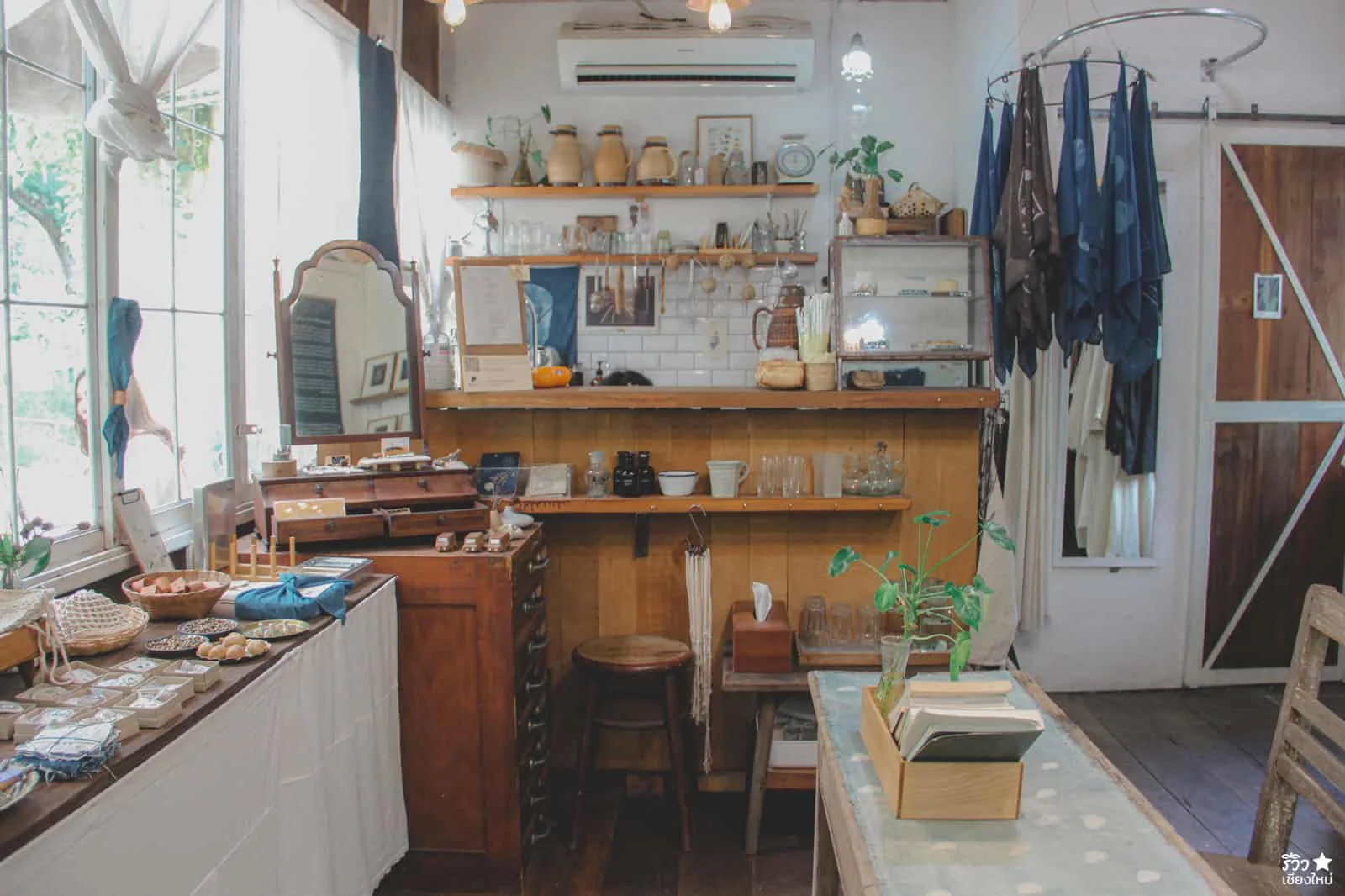 ถ้าเข้ามาภายในร้าน จะพบว่า ของตกแต่งร้านส่วนมากจะเป็นพวกของจีปาถะ ที่เกี่ยวกับเสื้อผ้า นั้นเพราะว่าที่ร้านเปิดเป็น Studio Handmade สอนมัดย้อมสีเสื้อผ้า เย็บผ้า ทำกระเป๋า หมวก มาก่อนและตอนนี้ก็ยังรับสอนอยู่จ้าา แค่แบ่งพื้นที่มาเปิดคาเฟ่เพิ่มเฉยๆ