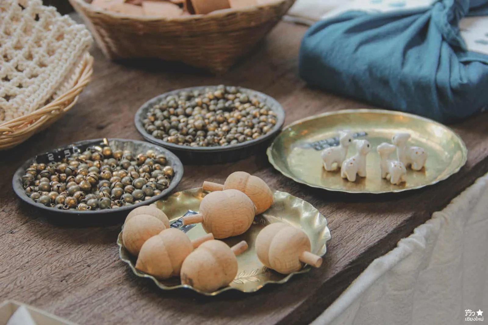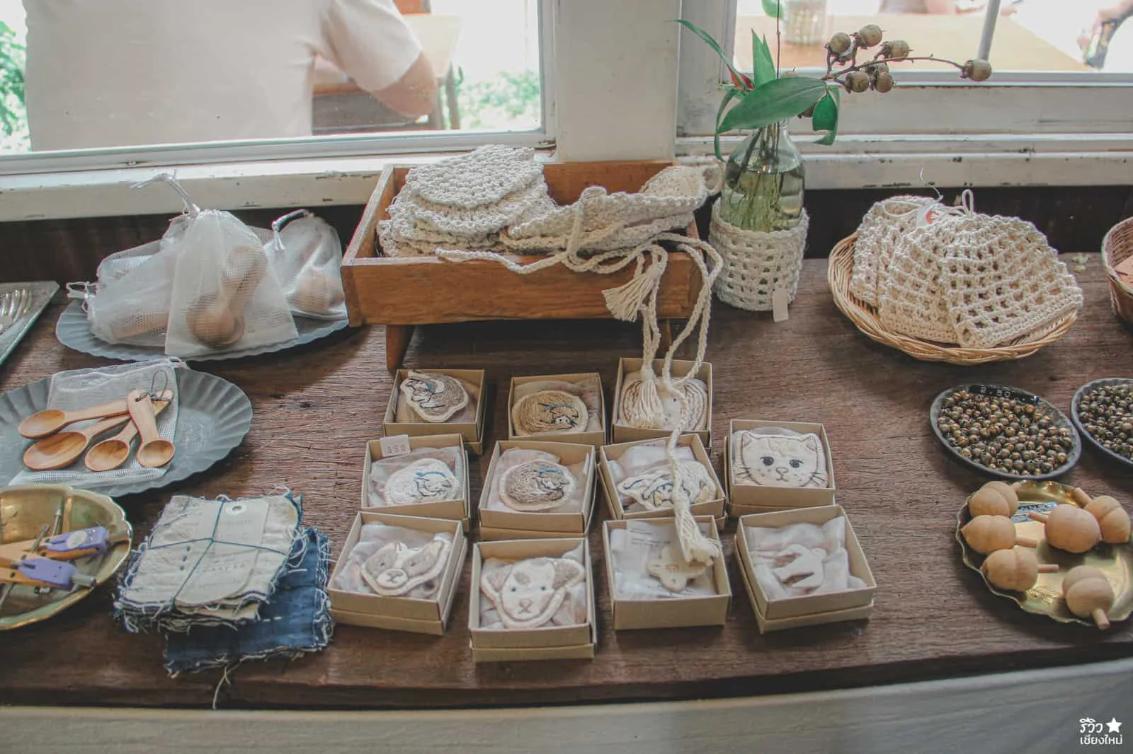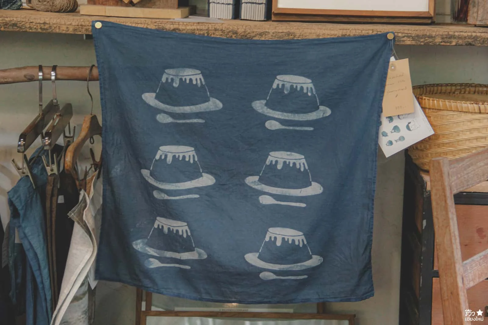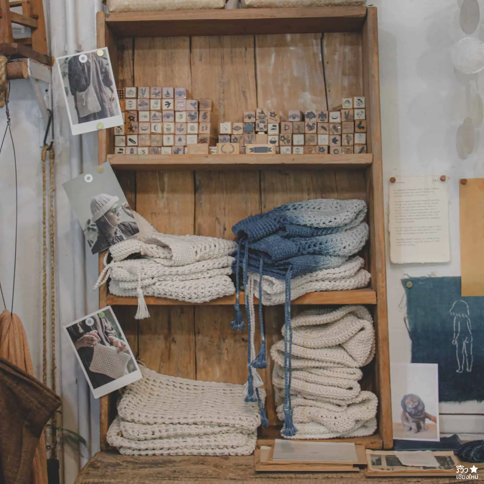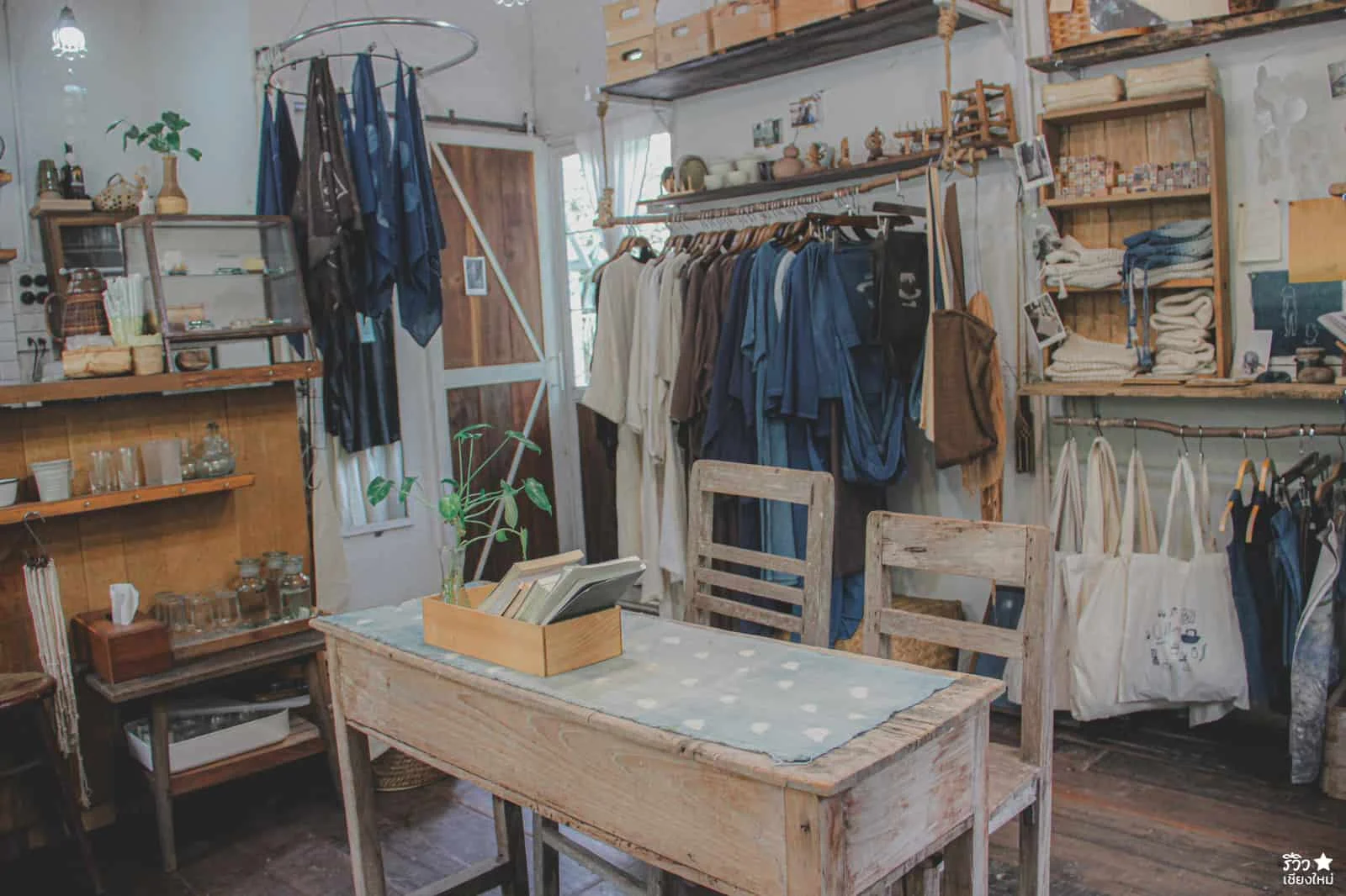 ถ้าเข้ามาภายในร้าน จะพบว่า ของตกแต่งร้านส่วนมากจะเป็นพวกของจีปาถะ ที่เกี่ยวกับเสื้อผ้า นั้นเพราะว่าที่ร้านเปิดเป็น Studio Handmade สอนมัดย้อมสีเสื้อผ้า เย็บผ้า ทำกระเป๋า หมวก มาก่อนและตอนนี้ก็ยังรับสอนอยู่จ้าา แค่แบ่งพื้นที่มาเปิดคาเฟ่เพิ่มเฉยๆ