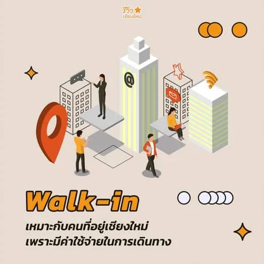 วิธีการ Walk-in เป็นวิธีที่บางคนอาจจะมองดูว่าเป็นวิธีที่ไม่ค่อยมีคนทำแล้ว แต่ยังมีบางบริษัทที่ยังมีเปิดรับแบบให้ Walk-in อยู่ เพราะบางที่มีการ Walk-in Interview คือการสมัครและสัมภาษณ์รู้ผลในทันที ซึ่งก็อาจจะให้เราลดค่าใช้จ่ายการเดินทาง แต่ควรศึกษารายละเอียดให้ดีก่อน ว่าทางบริษัทใช้เอกสารอะไรบ้างในการสมัคร และต้องรู้ว่ามีบริษัทไหนบ้างที่เปิดให้ Walk-in วิธีนี้เหมาะกับคนที่อาศัยอยู่เชียงใหม่ คนที่อยู่ไกลก็อาจจะมีค่าใช้จ่ายในการเดินทาง