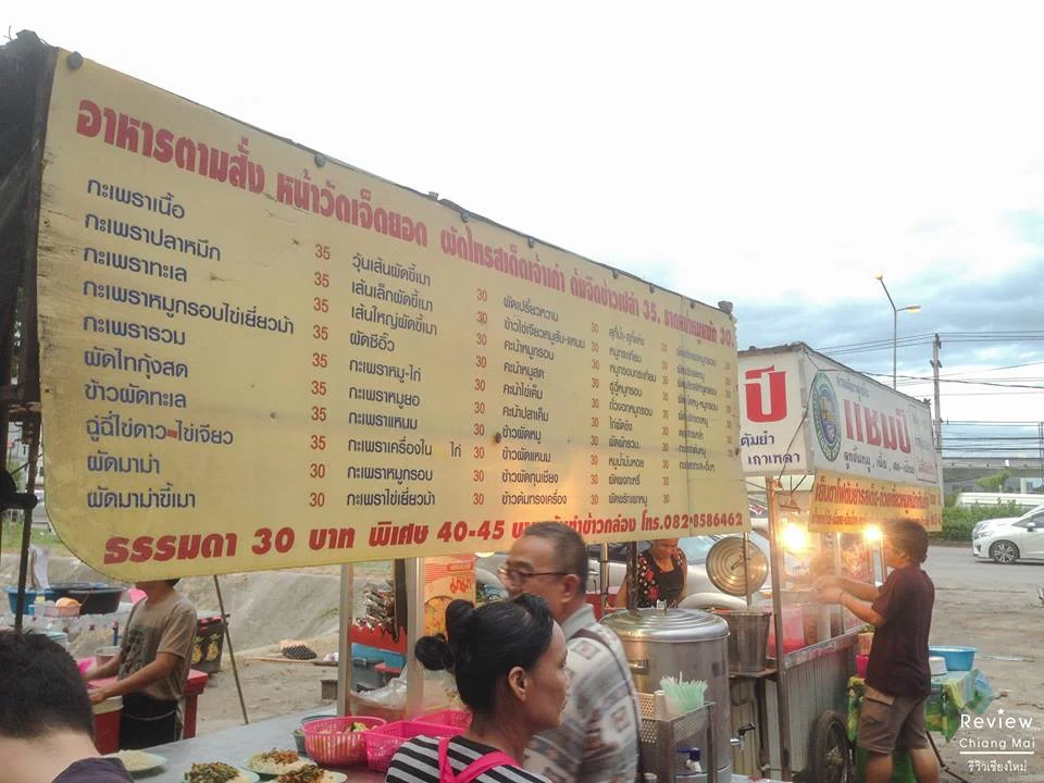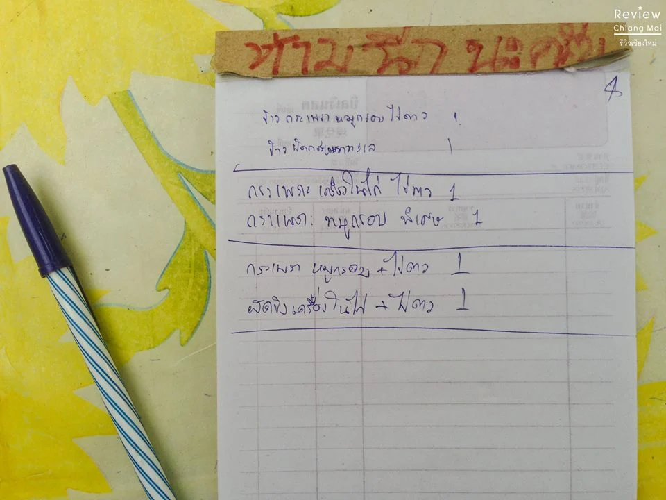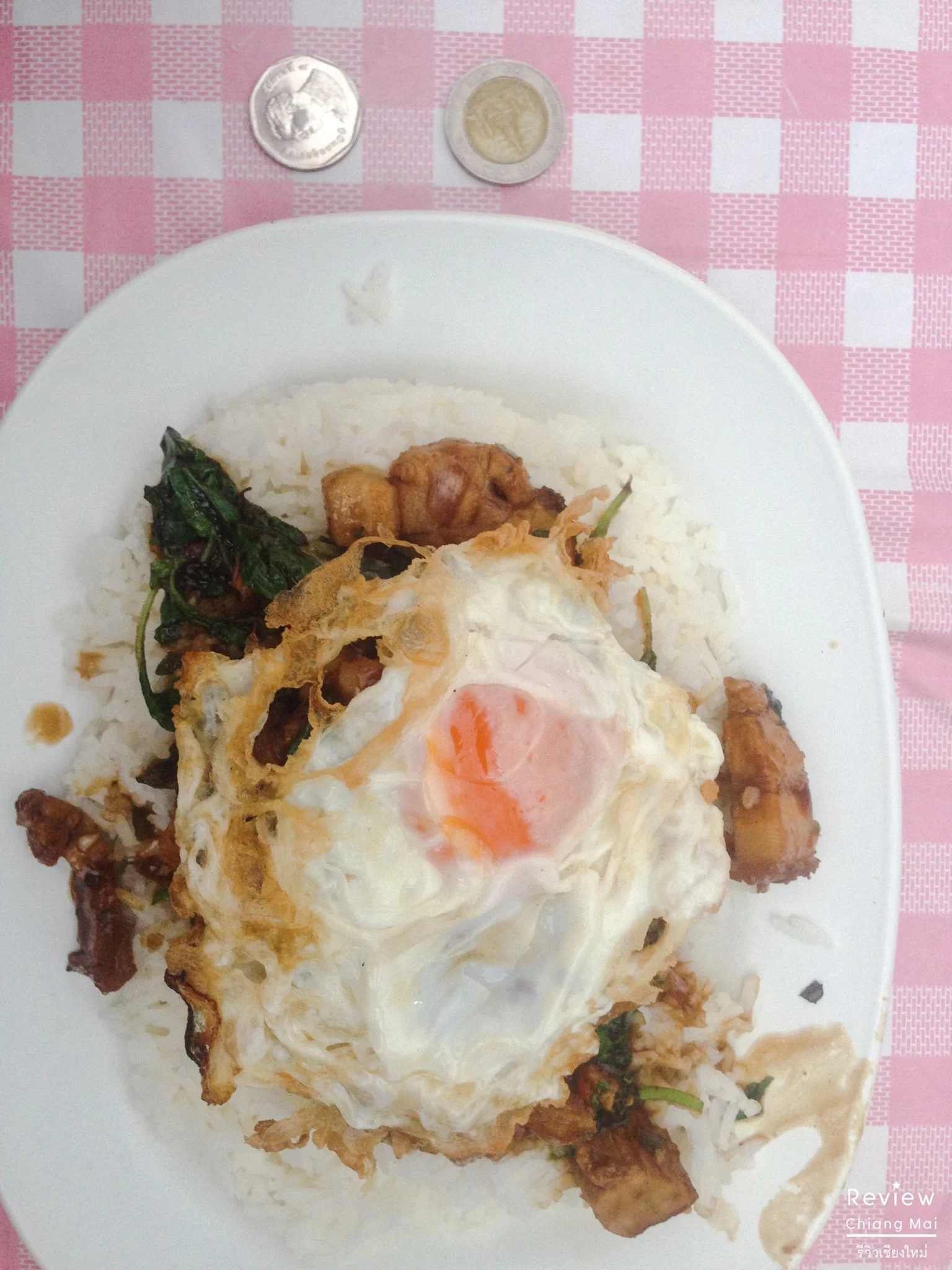 ถึงร้านแล้ว ชื่อ ร้านอาหารตามสั่งหน้าวัดเจ็ดยอด แต่คนแถวนั้นจะเรียก ข้าวควาย เราก็ยังงงๆ ว่าทำไมถึงเรียกแบบนั้น แต่ด้วยความหิวช่างความสงสัยไปก่อน จัดเลยล่ะกัน ที่ร้านจะมีร้านที่ติดกัน คือร้านก๋วยเตี๋ยวกับร้านอาหารตามสั่ง ซึ่งมันก็คือร้านเดียวกันนั่นแหละ ด้วยความที่อยากกินข้าวก็สั่งเมนูโปรดเลยละกัน กะเพราหมูกรอบไข่ดาว กับ กะเพราทะเล ไปเลย แต่ร้านนี้เวลาจะสั่ง ต้องไปสั่งที่โต๊ะหน้ารถเข็น กลิ่นอาหารที่กำลังทำก็จะโชยมาเตะจมูกอยู่หน่อยๆ เรียกน้ำย่อยได้ดีเลยทีเดียว