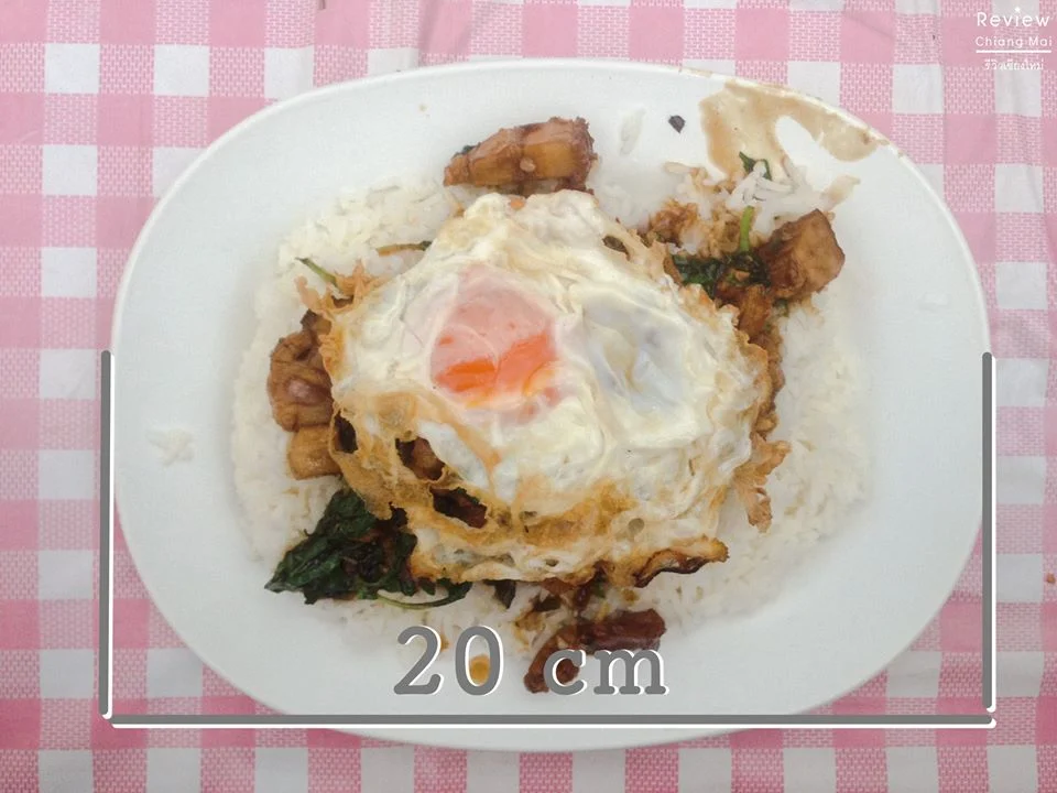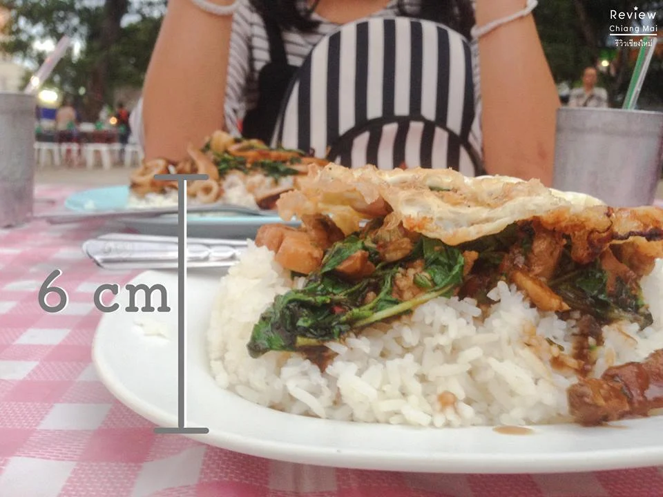 – สั่งข้าวกะเพราหมูกรอบไข่ดาว ราคา 40 บาท ได้หมูกรอบชิ้นโต กัดเสียงดังกรุบๆ มา 14 ชิ้น ความสูงของกองข้าว 6 เซนติเมตร กว้าง 20 เซนติเมตร ส่วนกะเพราทะเลราคา 30 บาท จัดหนักจัดเต็มสมชื่อ!!