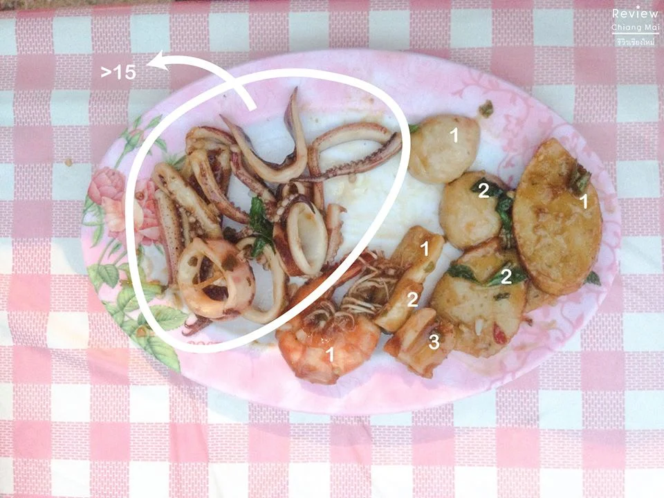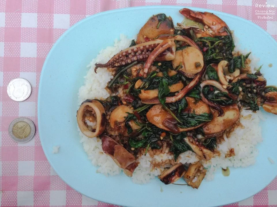 อีกเมนูหนึ่งที่ลองมากิน กะเพราทะเลที่เรียกได้ว่าไม่หวงเครื่องเลยก็ว่าได้ ด้วยจำนวนปลาหมึกกว่า 15 ชิ้น ทั้งหนวดทั้งแหวน กุ้งอีก 1 ตัวเนื้อเน้นๆ รวมถึงลูกชิ้นปลาสองชิ้น ปลาเส้นอีก 3 ชิ้น และปลาวงอีก 2 ชิ้น ด้วยความสูงข้าวจากระดับจาน 5 เซนติเมตร
